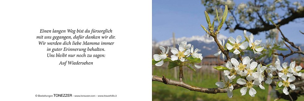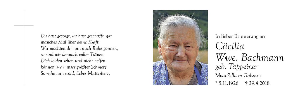 Wir begleiten unsere liebe Mama und Oma am Mittwoch, 2. Mai, um 14.30 Uhr vom Kirchplatz aus zum Begräbnisgottesdienst in die Pfarrkirche und anschließend zur letzten Ruhe auf den Ortsfriedhof von Kastelbell-Marein.