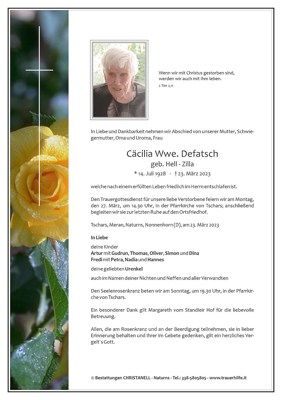 Den Trauergottesdienst für unsere liebe Verstorbene feiern wir am Montag, den 27. März, um 14.30 Uhr, in der Pfarrkirche von Tschars; anschließend begleiten wir sie zur letzten Ruhe auf den Ortsfriedhof.