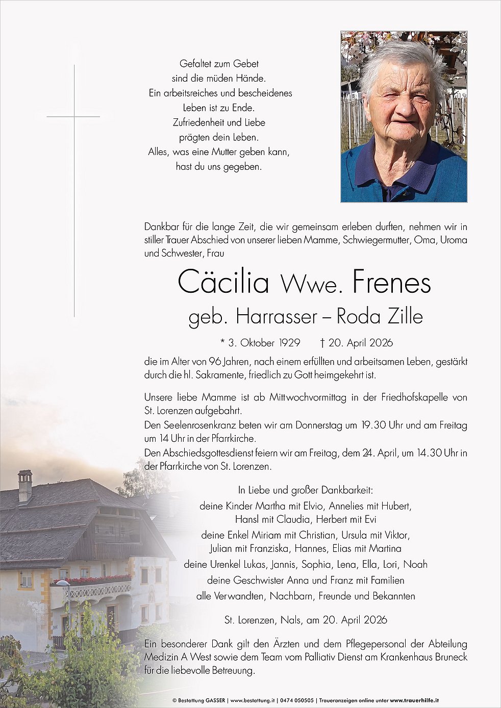 die im Alter von 96 Jahren, nach einem erfüllten und arbeitsamen Leben, gestärkt durch die hl. Sakramente, friedlich zu Gott heimgekehrt ist.