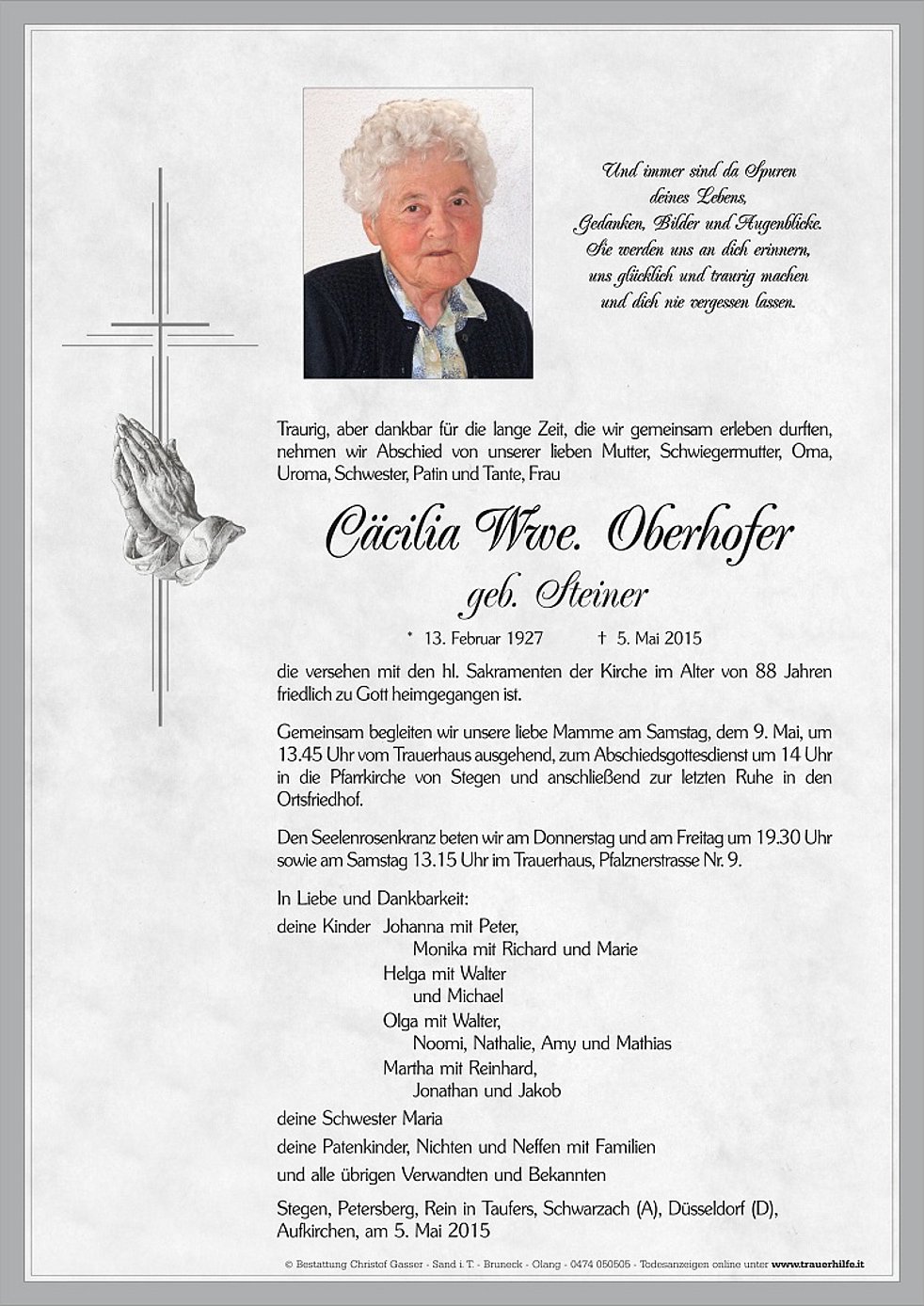 die versehen mit den hl. Sakramenten der Kirche im Alter von 88 Jahren friedlich zu Gott heimgegangen ist.