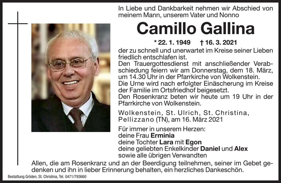 Den Trauergottesdienst mit anschließender Verabschiedung feiern wir am Donnerstag, dem 18. März, um 14.30 Uhr in der Pfarrkirche von Wolkenstein. Die Urne wird nach erfolgter Einäscherung im Kreise der Familie im Ortsfriedhof beigesetzt.