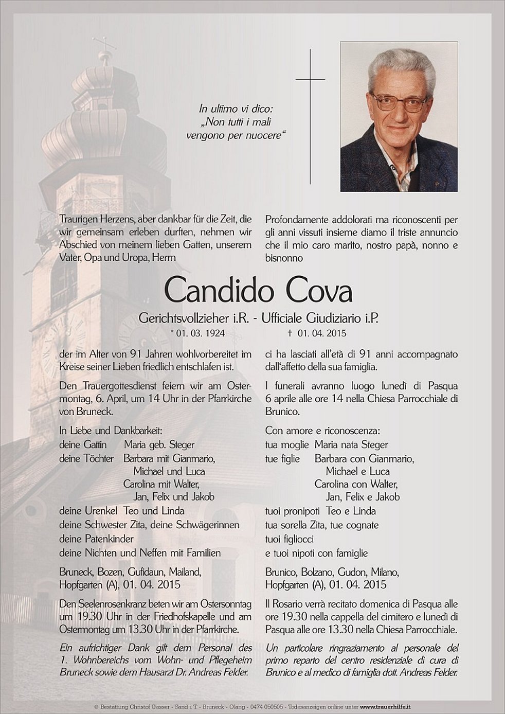 I funerali avranno luogo lunedì di Pasqua 6 aprile alle ore 14 nella Chiesa Parrocchiale di Brunico.