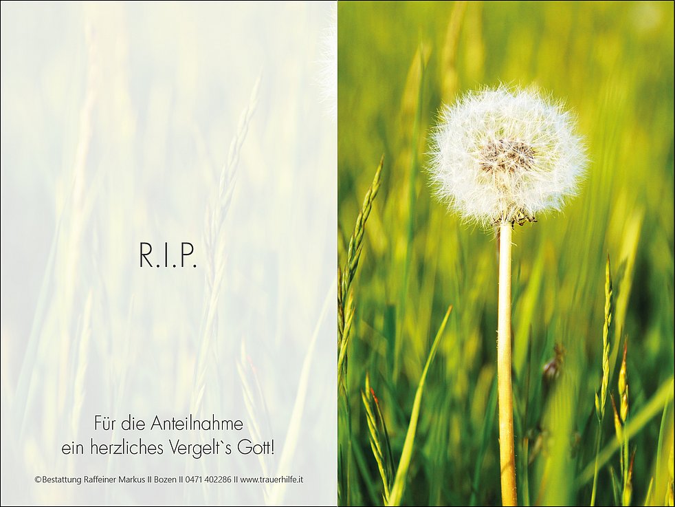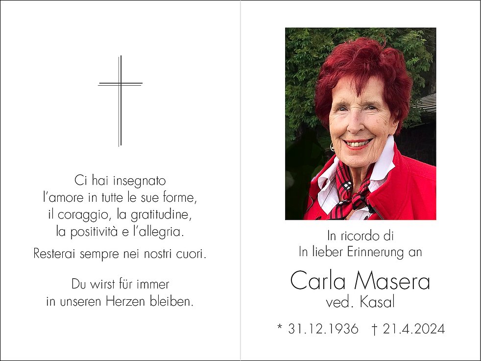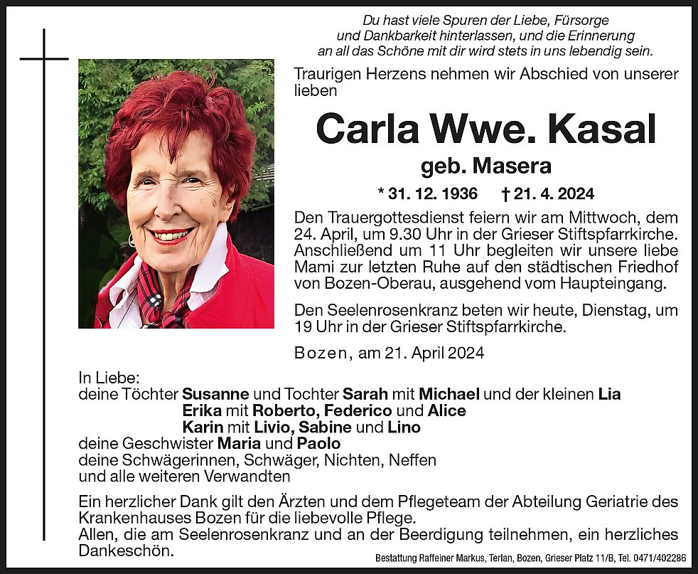 Den Trauergottesdienst feiern wir am Mittwoch, dem 24. April, um 9.30 Uhr in der Grieser Stiftspfarrkirche. Anschließend um 11 Uhr begleiten wir unsere liebe Mami zur letzten Ruhe auf den städtischen Friedhof von Bozen-Oberau, ausgehend vom Haupteingang.