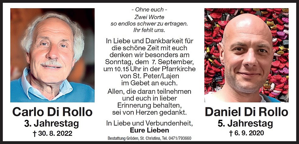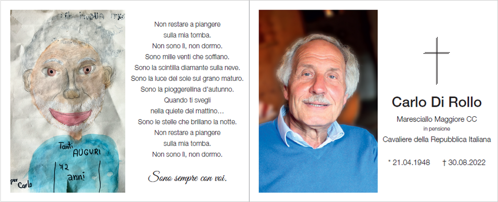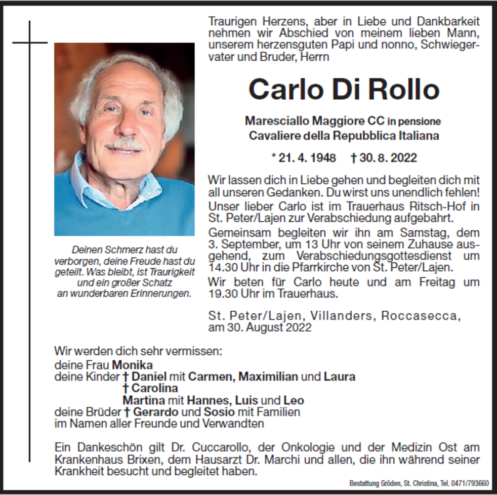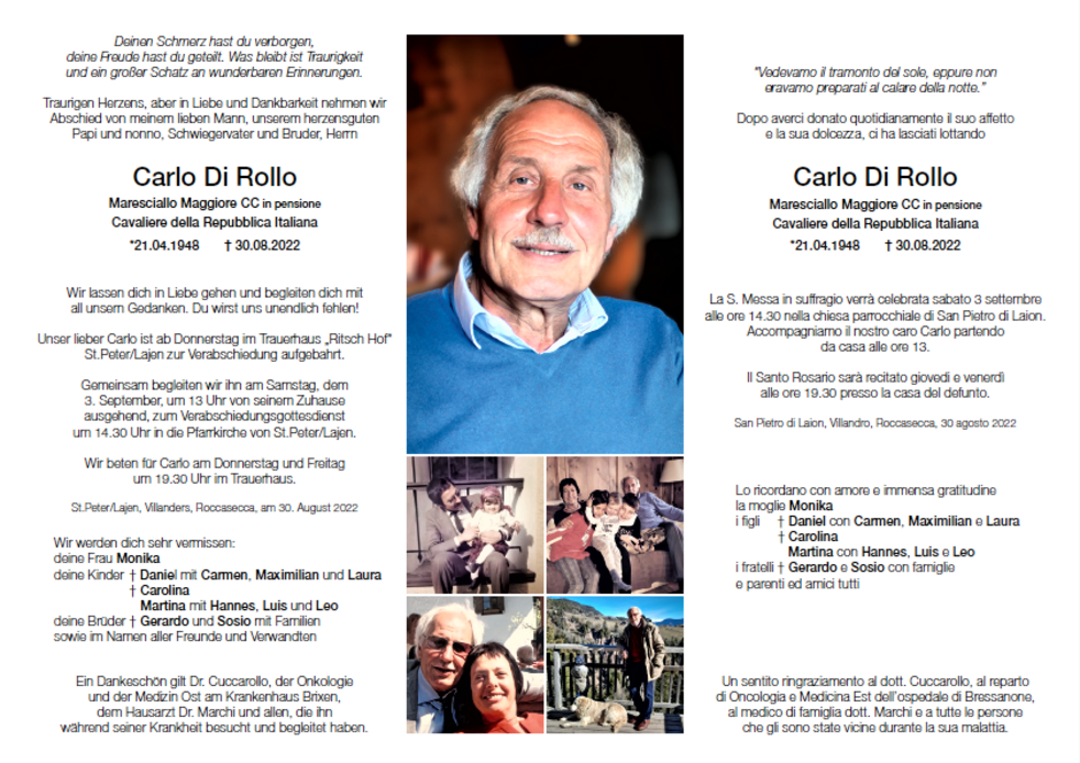 Unser lieber Carlo ist ab Donnerstag im Trauerhaus „Ritsch Hof“ St.Peter/Lajen zur Verabschiedung aufgebahrt.