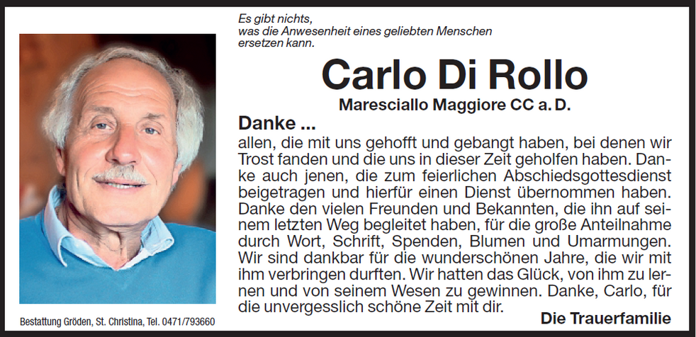 Ein Dankeschön gilt Dr. Cuccarollo, der Onkologie und der Medizin Ost am Krankenhaus Brixen, dem Hausarzt Dr. Marchi und allen, die ihn während seiner Krankheit besucht und begleitet haben.