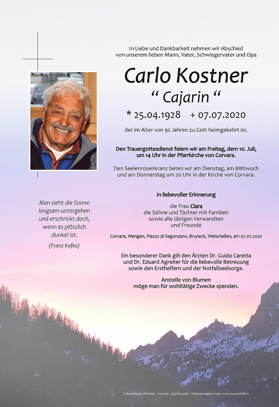 Den Trauergottesdienst feiern wir am Freitag, dem 10. Juli, um 14 Uhr in der Pfarrkirche von Corvara.