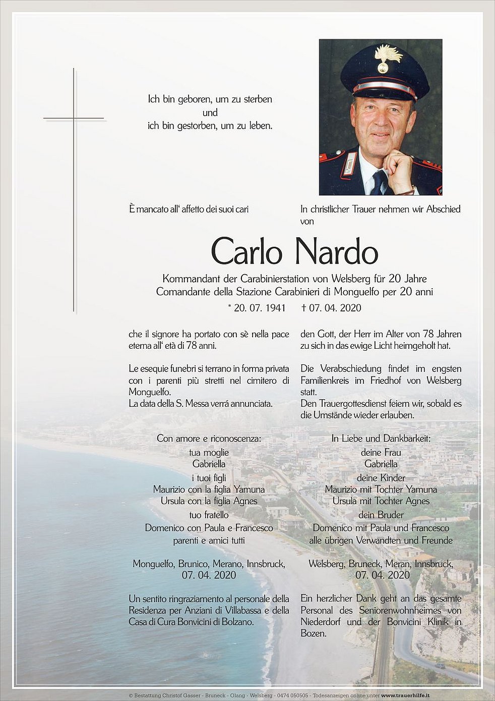 Le esequie funebri si terrano in forma privata con i parenti più stretti nel cimitero di Monguelfo.