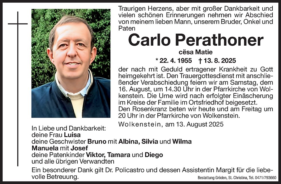 Den Trauergottesdienst mit anschließender Verabschiedung feiern wir am Samstag, dem 16. August, um 14.30 Uhr in der Pfarrkirche von Wolkenstein. Die Urne wird nach erfolgter Einäscherung im Kreise der Familie im Ortsfriedhof beigesetzt.