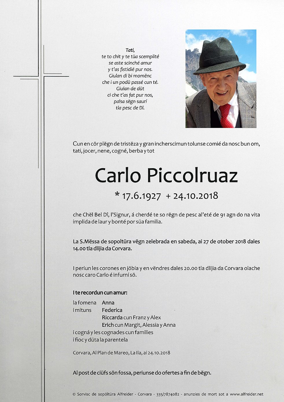 Den Trauergottesdienst feiern wir am Samstag, dem 27. Oktober, um 14 Uhr in der Pfarrkirche von Corvara.