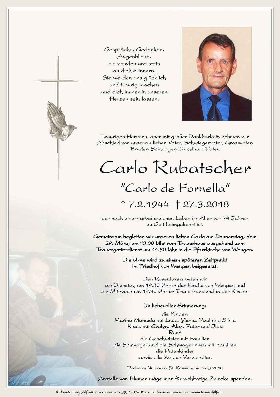 Gemeinsam begleiten wir unseren lieben Carlo am Donnerstag, dem 29. März, um 13.30 Uhr vom Trauerhaus ausgehend zum Trauergottesdienst um 14.30 Uhr in die Pfarrkirche von Wengen.