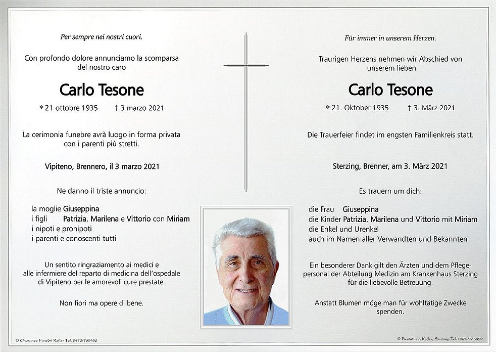 Un sentito ringraziamento ai medici e alle infermiere del reparto di medicina dell‘ospedale di Vipiteno per le amorevoli cure prestate.
