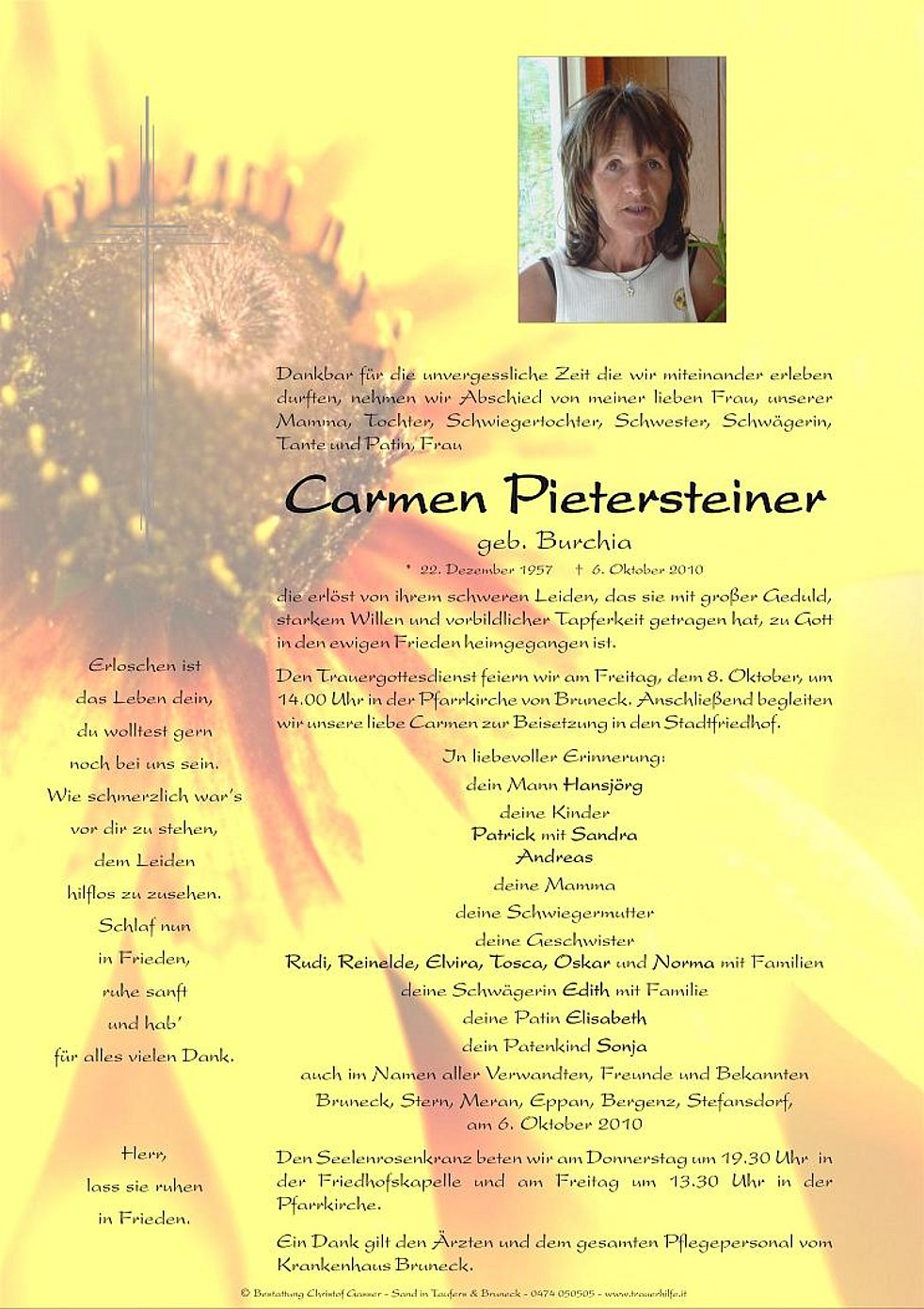 Den Trauergottesdienst feiern wir am Freitag, dem 8. Oktober, um 14.00 Uhr in der Pfarrkirche von Bruneck. Anschließend begleiten wir unsere liebe Carmen zur Beisetzung in den Stadtfriedhof.
