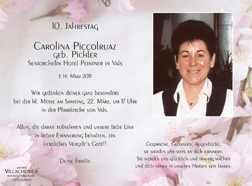 Unser Herz will dich halten, unsere Liebe dich umfangen, unser Verstand muss dich gehen lassen, denn deine Kraft war zu Ende. In Liebe und Dankbarkeit nehmen wir Abschied von meiner lieben Frau, unserer guten Mama und geliebten Oma, Frau Carolina Piccolruaz geb. Pichler Seniorchefin Hotel Peintner in Vals die nach langer, schwerer, mit großer Geduld ertragener Krankheit im Alter von 64 Jahren zu Gott heimgekehrt ist. Wir begleiten unsere liebe Mama am Donnerstag, den 19. März um 13.45 Uhr vom Trauerhaus ausgehend zum Kirchplatz, wo um 14.30 Uhr die Einsegnung stattfindet. Anschließend erfolgt der Trauergottesdienst mit Verabschiedung in der Pfarrkirche von Vals. Vals, Terenten, Laas, Pfalzen, am 14. März 2015 In Liebe: dein Mann Willi deine Kinder Anita mit Helmuth Carmen mit Georg Philipp mit Larissa deine über alles geliebten Enkel Michelle, Nadine und Nicole deine Geschwister Anni, Sepp, Rudolf und Sepp mit Familien deine Schwager, Schwägerinnen, Nichten, Neffen deine Patenkinder und alle Verwandten und Freunde Den Rosenkranz beten wir am Dienstag und Mittwoch, jeweils um 19.30 Uhr, sowie am Donnerstag um 13.15 Uhr im Trauerhaus.