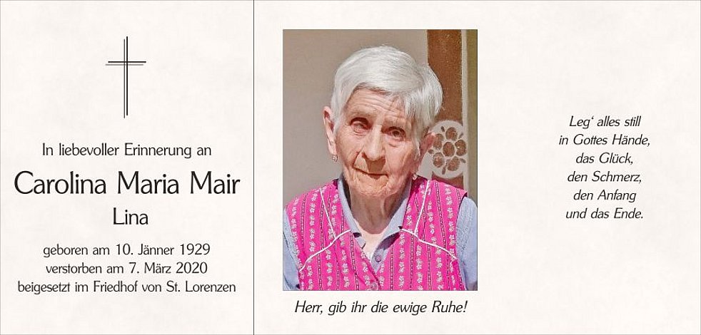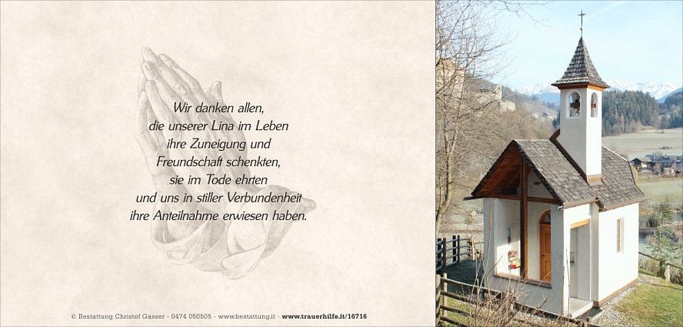 Ein besonderer Dank gilt dem Hausarzt Dr. Martin Kofler, den Sprengelschwestern und der Pflegerin Sieglinde.