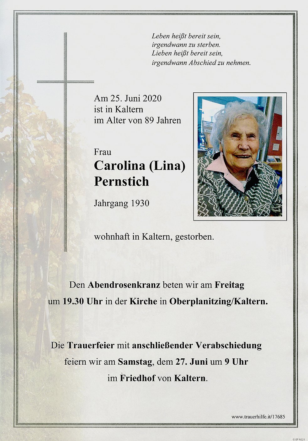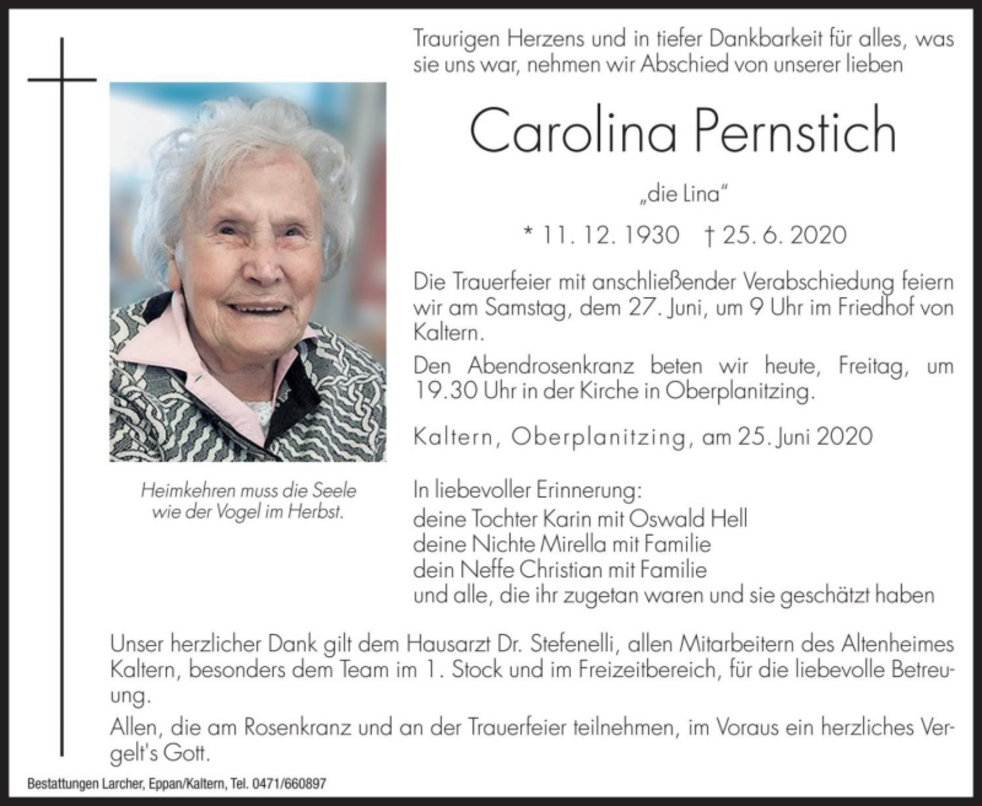 Unser herzlicher Dank gilt dem Hausarzt Dr. Stefenelli, allen Mitarbeitern des Altenheimes Kaltern, besonders dem Team im 1. Stock und im Freizeitbereich für die liebevolle Betreuung.