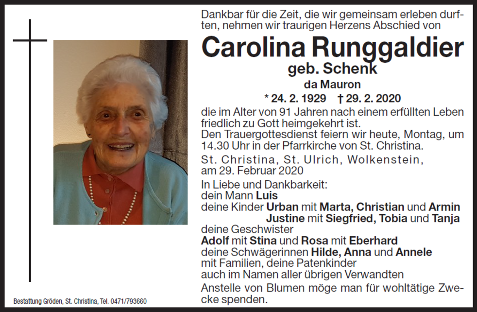 Den Trauergottesdienst feiern wir am Montag, dem 02. März, um 14.30 Uhr in der Pfarrkirche von St. Christina.