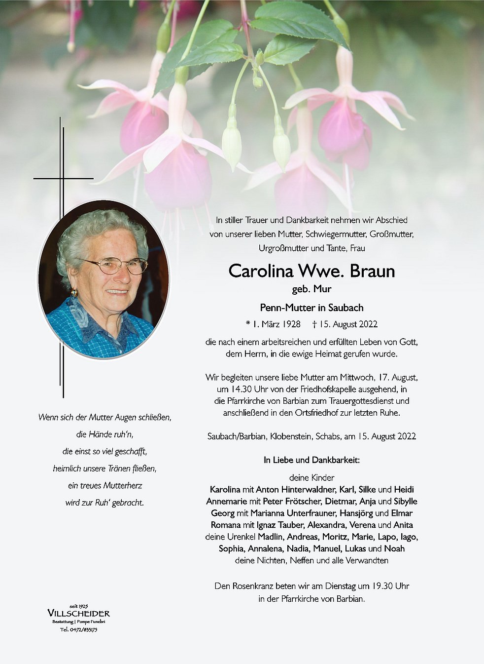 Begräbnisgottesdienst: 18.08. - 14:30 Uhr Barbian