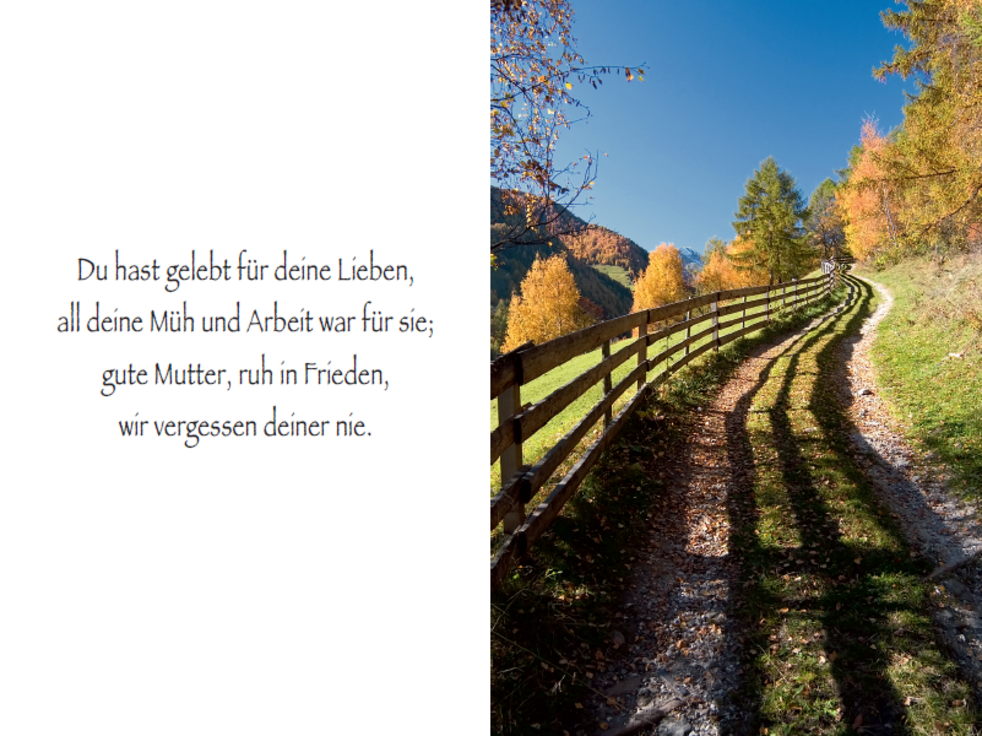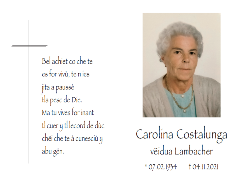 Den Trauergottesdienst feiern wir am Samstag, dem 06. November, um 14.30 Uhr in der Pfarrkirche von Wolkenstein. Die Urne wird nach erfolgter Einäscherung im Kreise der Familie im Ortsfriedhof beigesetzt.