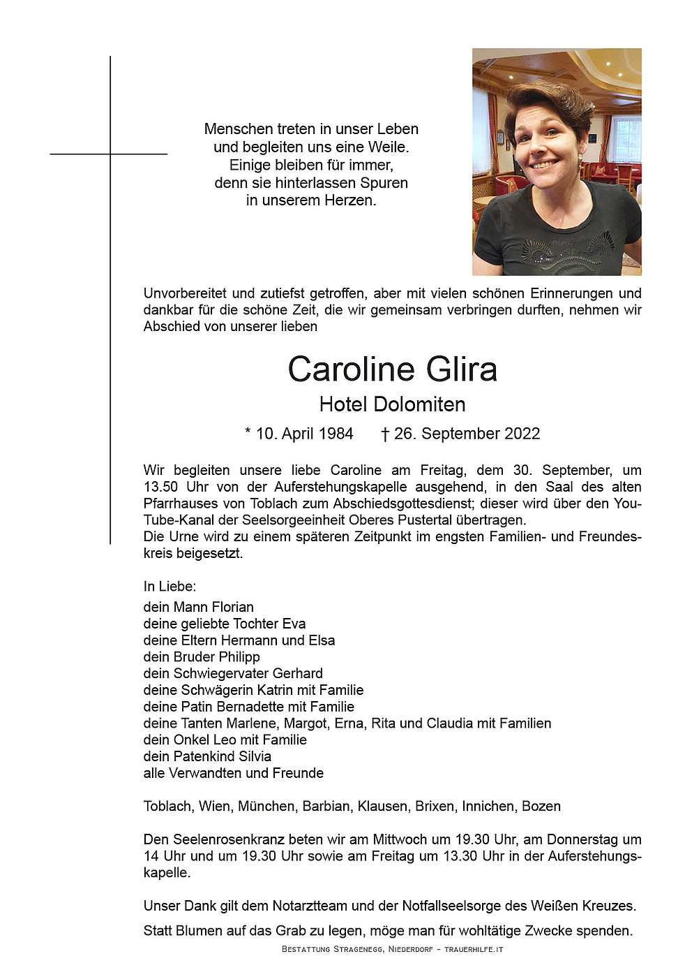 Wir begleiten unsere liebe Caroline am Freitag, dem 30. September, um 13.50 Uhr von der Auferstehungskapelle ausgehend, in den Saal des alten Pfarrhauses von Toblach zum Abschiedsgottesdienst; dieser wird über den YouTube-Kanal der Seelsorgeeinheit Oberes Pustertal übertragen.