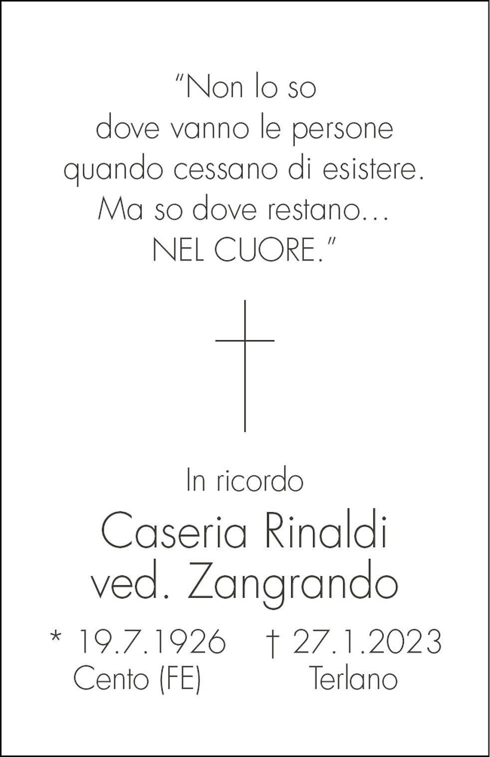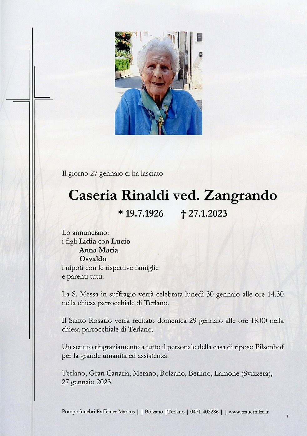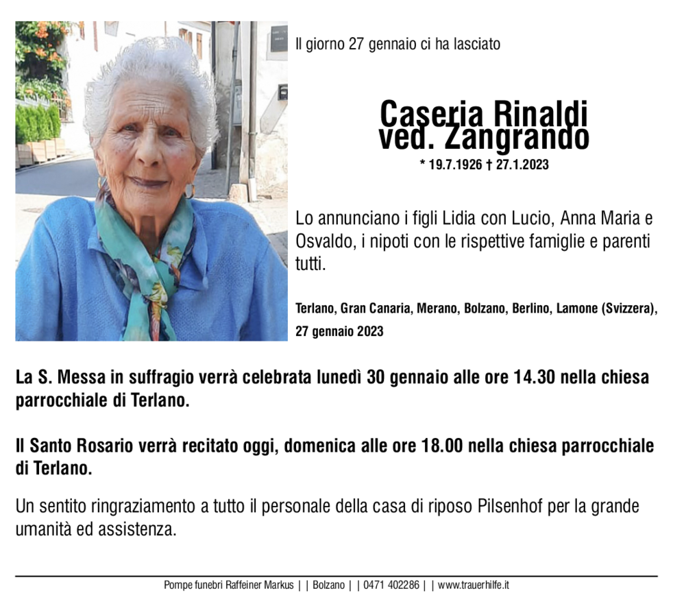 La S. Messa in suffragio verrà celebrata lunedì 30 gennaio alle ore 14.30 nella chiesa parrocchiale di Terlano.