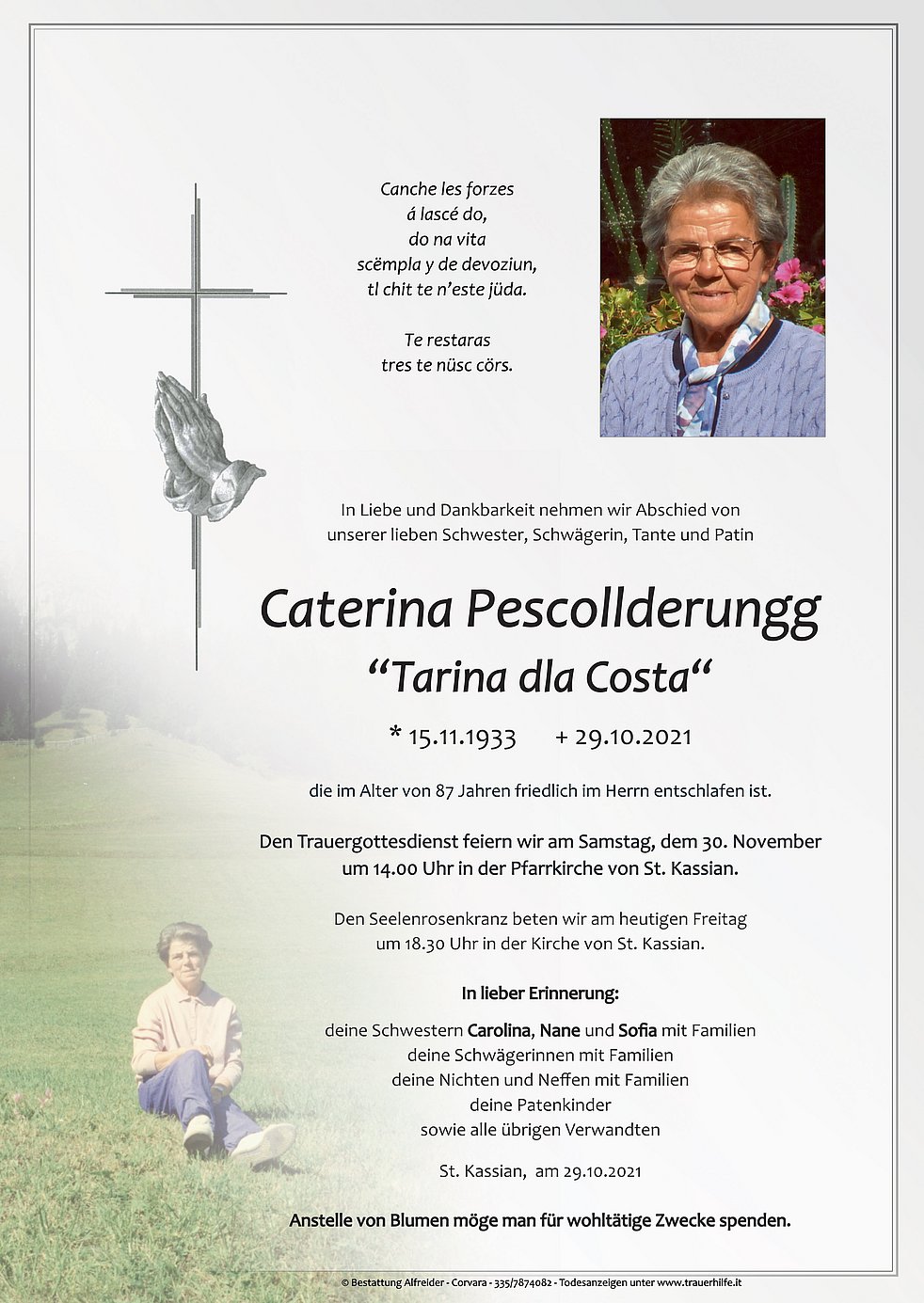 Den Trauergottesdienst feiern wir am Samstag, dem 30. Oktober um 14.00 Uhr in der Pfarrkirche von St. Kassian.