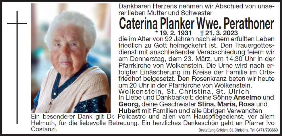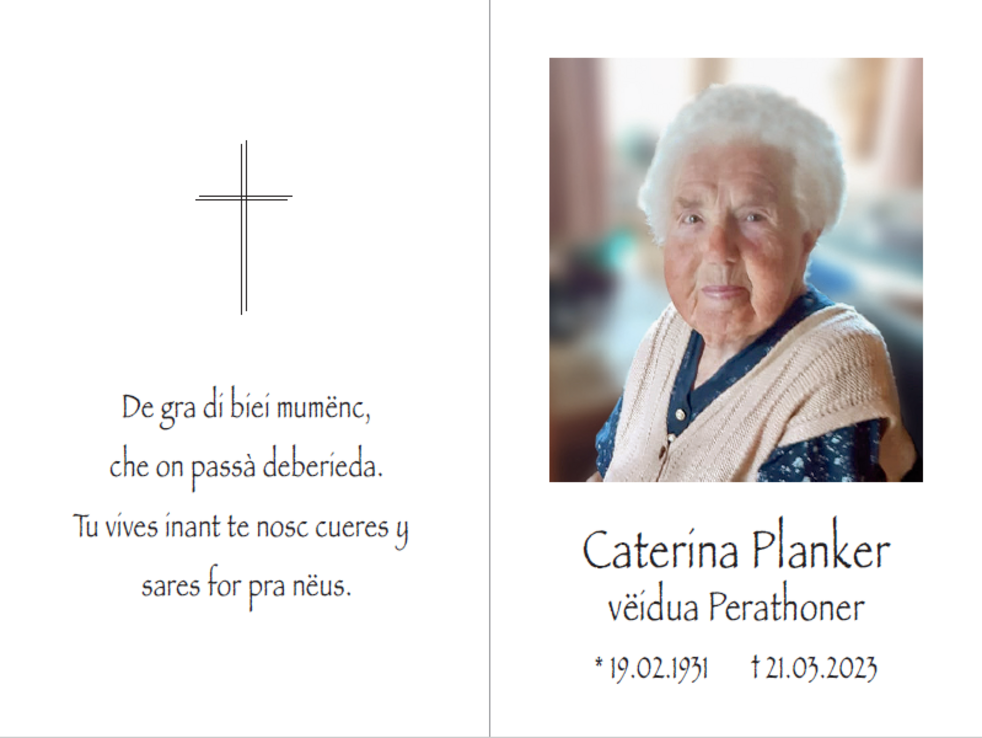 Den Trauergottesdienst mit anschließender Verabschiedung feiern wir am Donnerstag, dem 23. März, um 14.30 Uhr in der Pfarrkirche von Wolkenstein. Die Urne wird nach erfolgter Einäscherung im Kreise der Familie im Ortsfriedhof beigesetzt.