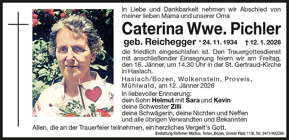 Den Trauergottesdienst mit anschließender Einsegnung feiern wir am Freitag, den 16. Jänner, um 14.30 Uhr in der St. Gertraud-Kirche in Haslach.