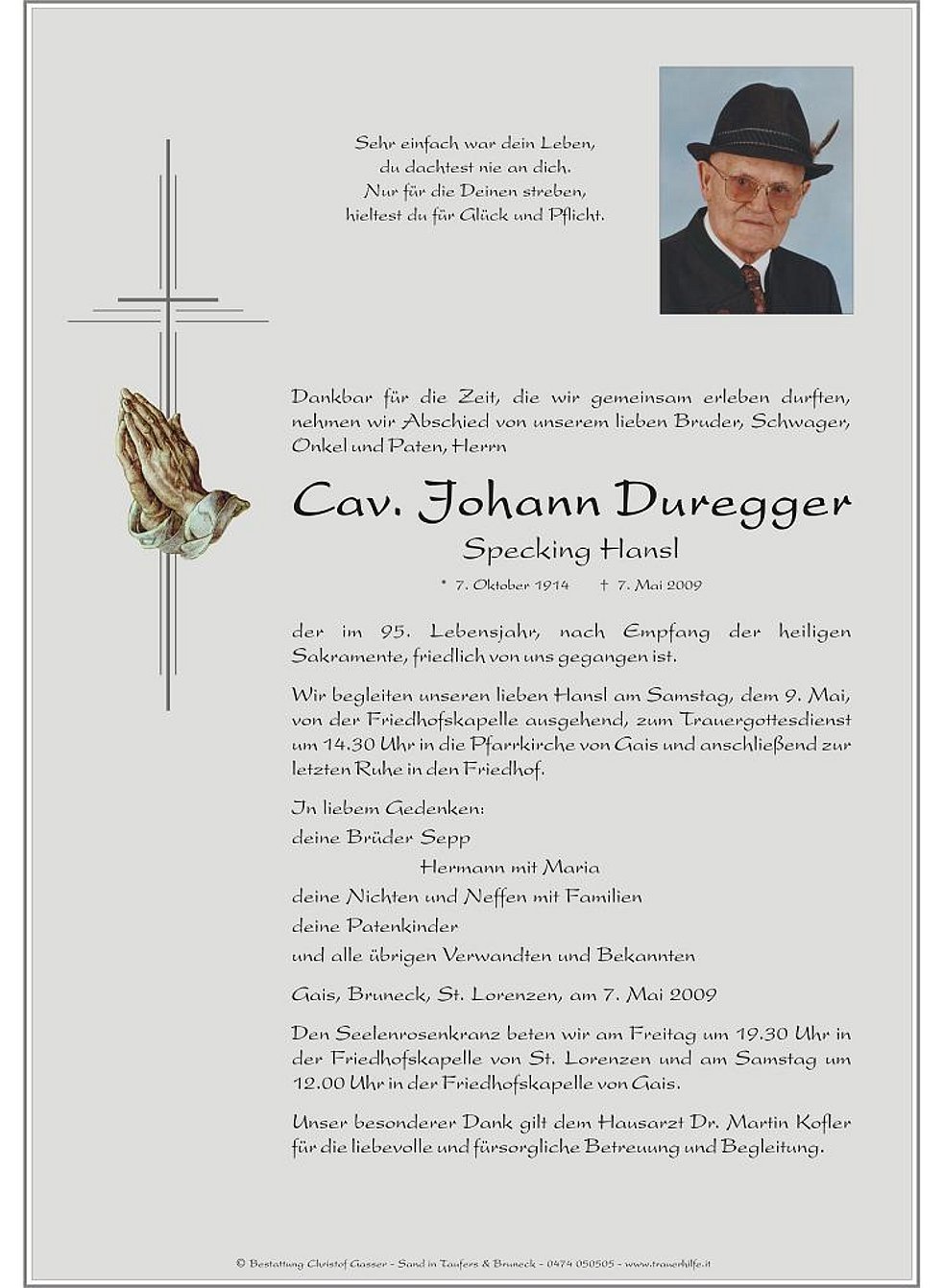 Wir begleiten unseren lieben Hansl am Samstag, dem 9. Mai, von der Friedhofskapelle ausgehend, zum Trauergottesdienst um 14.30 Uhr in die Pfarrkirche von Gais und anschließend zur letzten Ruhe in den Friedhof.
