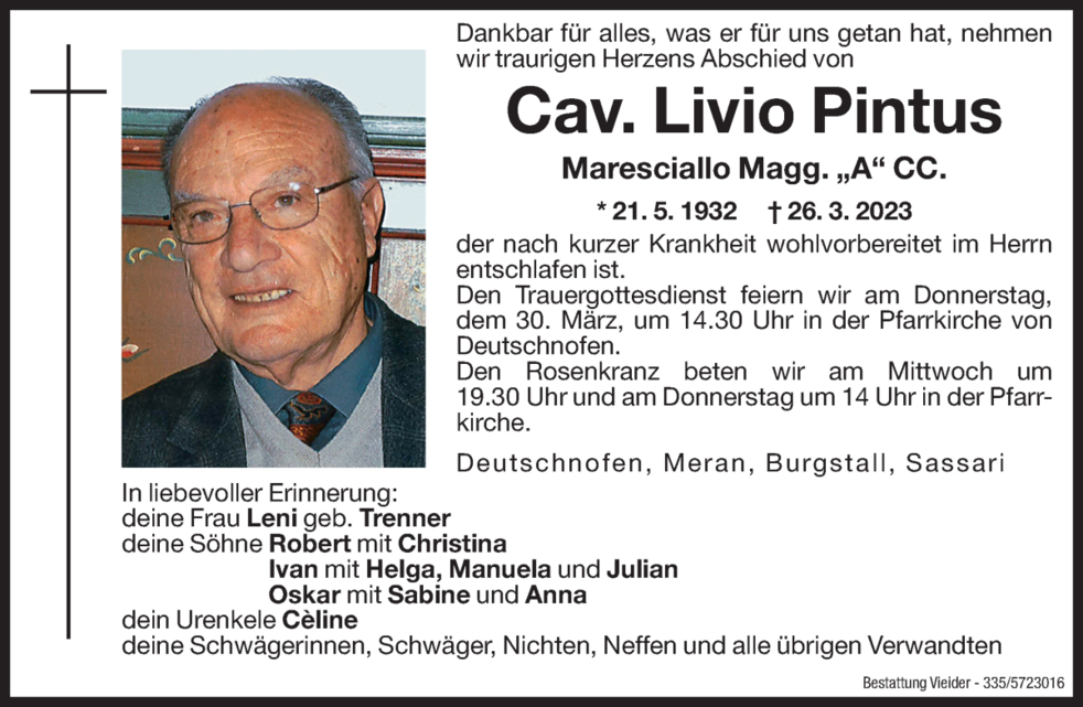 Den Trauergottesdienst feiern wir am Donnerstag, dem 30. März, um 14.30 Uhr in der Pfarrkirche von Deutschnofen.