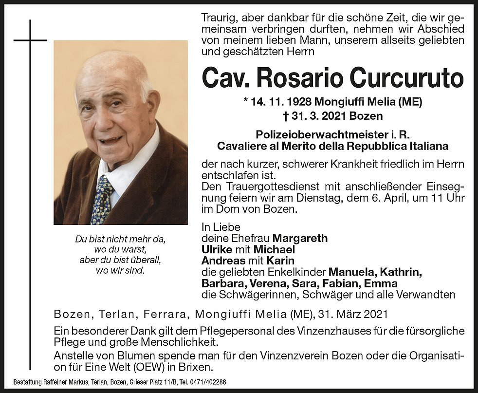 * 14.11.1928 Mongiuffi Melia (ME) † 31.3.2021 Bolzano
