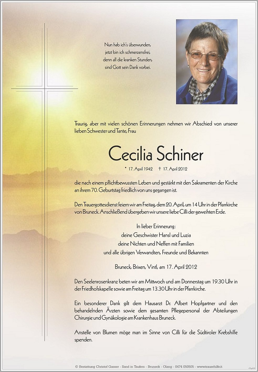 Anstelle von Blumen möge man im Sinne von Cilli für die Südtiroler Krebshilfe spenden.