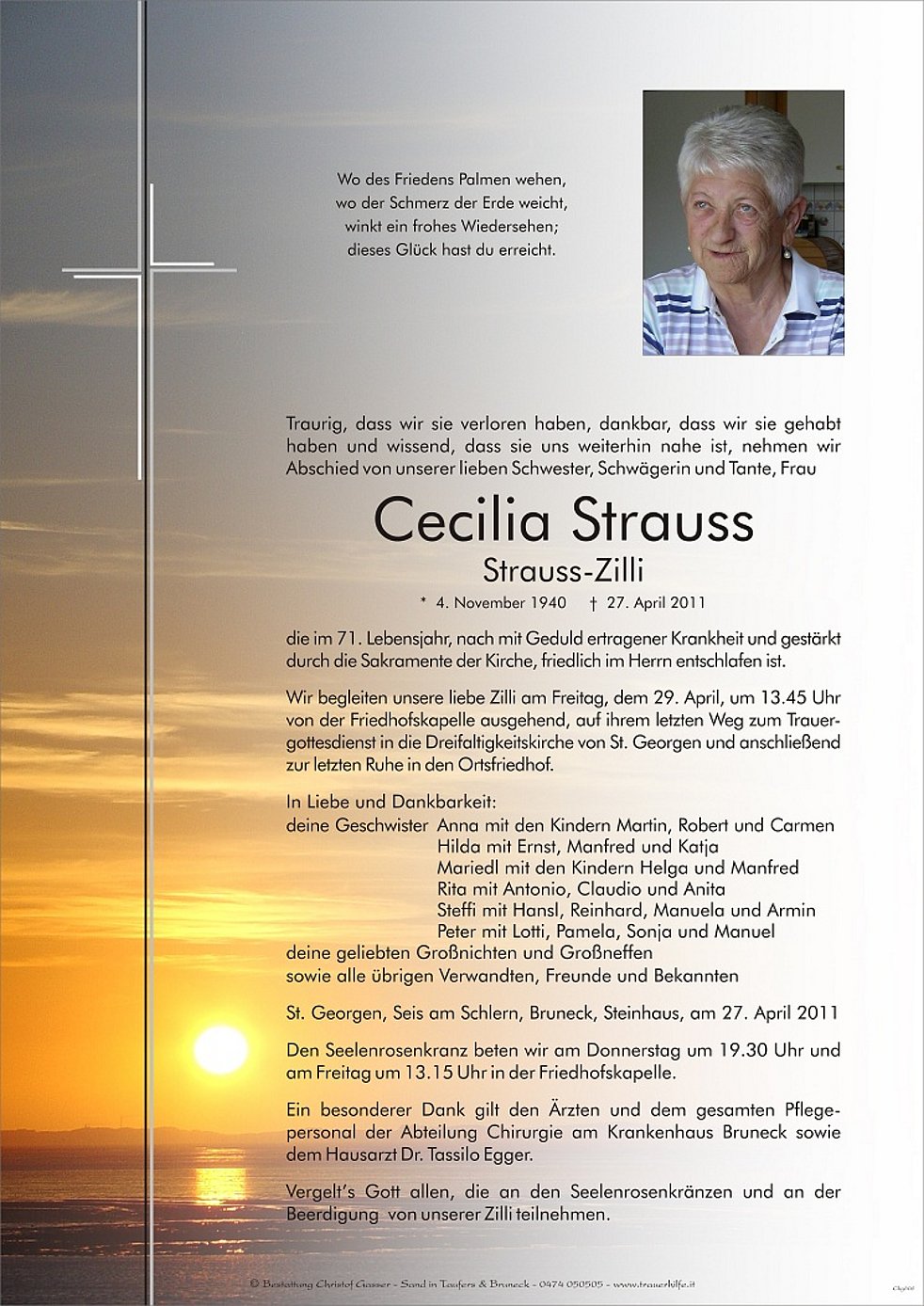 Wir begleiten unsere liebe Zilli am Freitag, dem 29. April, um 13.45 Uhr von der Friedhofskapelle ausgehend, auf ihrem letzten Weg zum Trauergottesdienst in die Dreifaltigkeitskirche von St. Georgen und anschließend zur letzten Ruhe in den Ortsfriedhof.