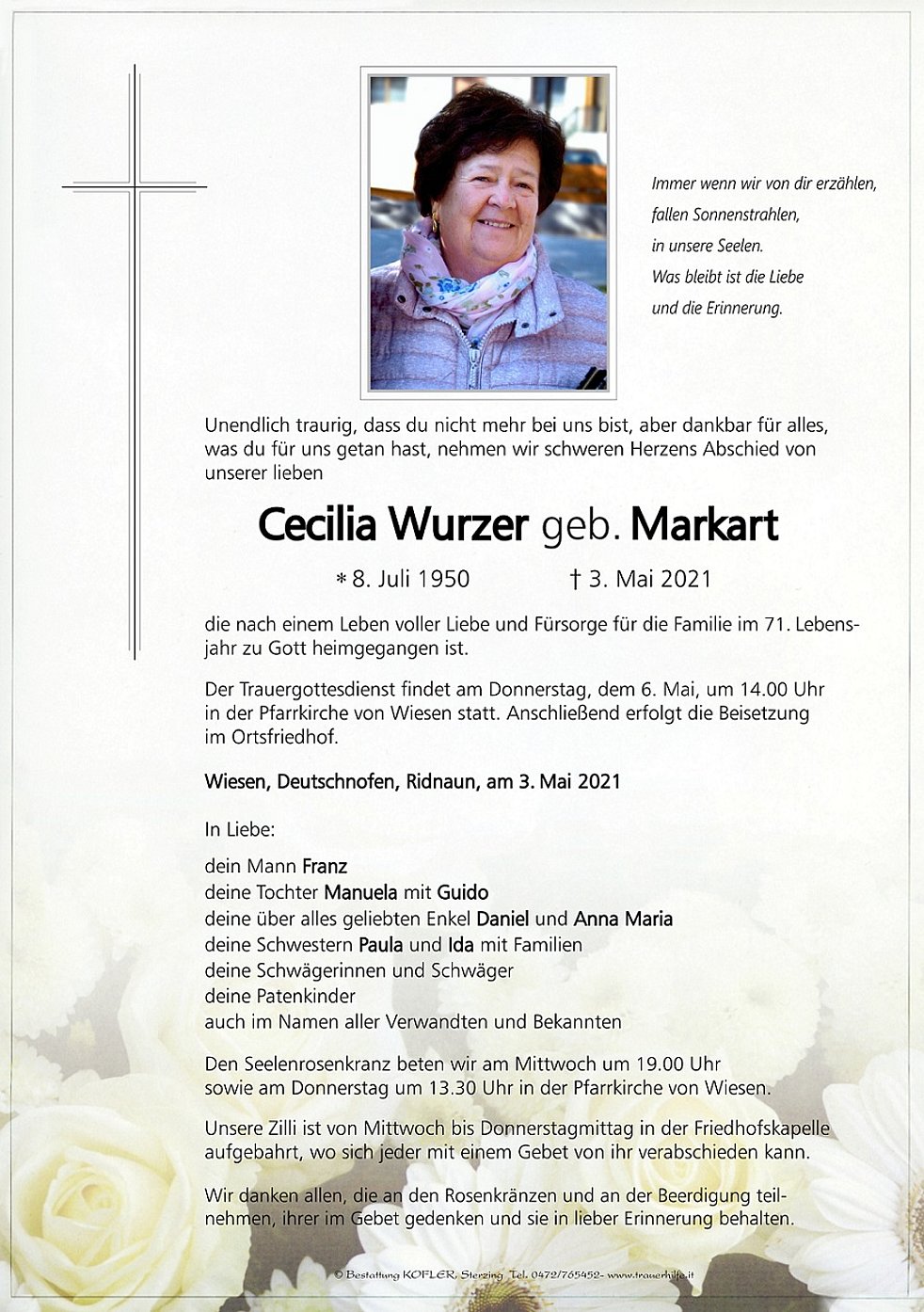 Der Trauergottesdienst findet am Donnerstag, dem 6. Mai, um 14.00 Uhr in der Pfarrkirche von Wiesen statt. Anschließend erfolgt die Beisetzung im Ortsfriedhof.