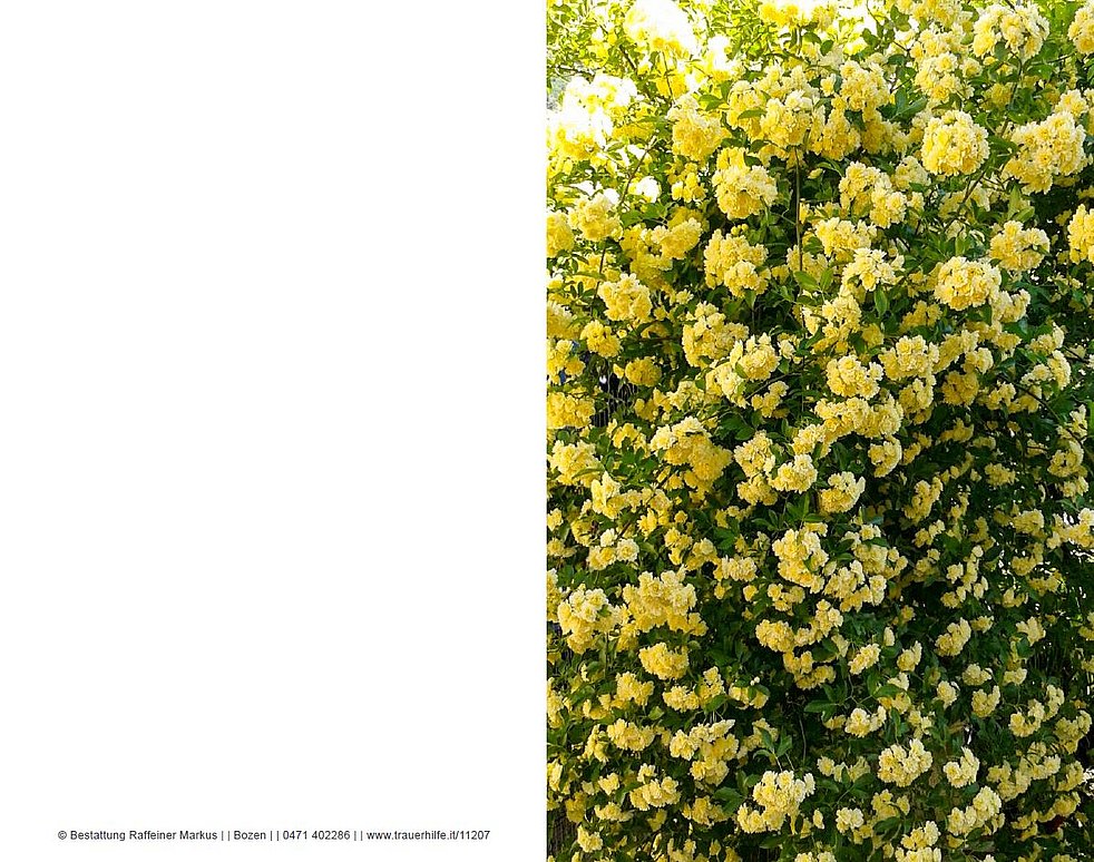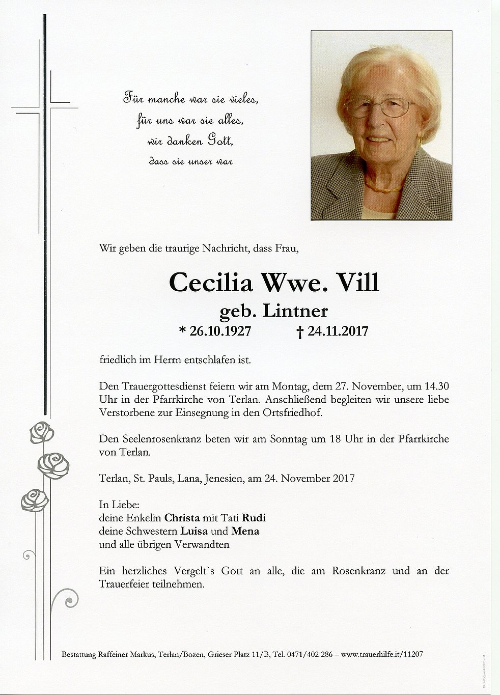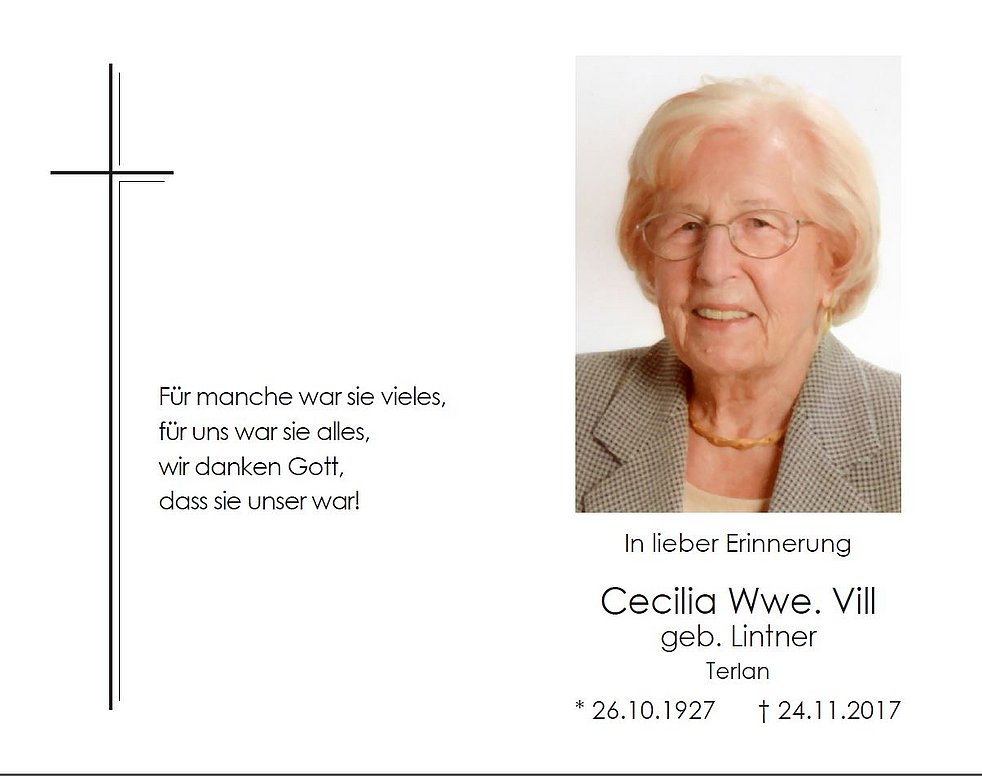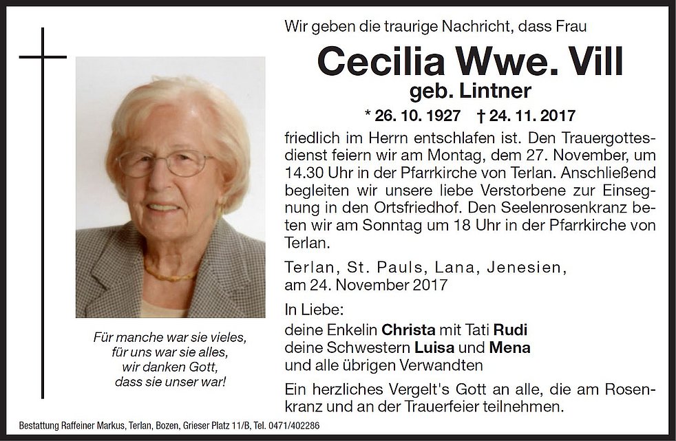 Den Trauergottesdienst feiern wir am Montag, dem 27. November, um 14.30 Uhr in der Pfarrkirche von Terlan. Anschließend begleiten wir unsere liebe Verstorbene zur Einsegnung in den Ortsfriedhof.