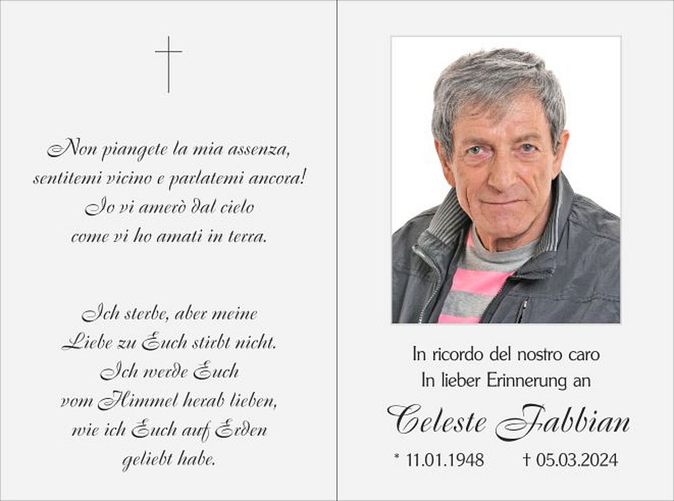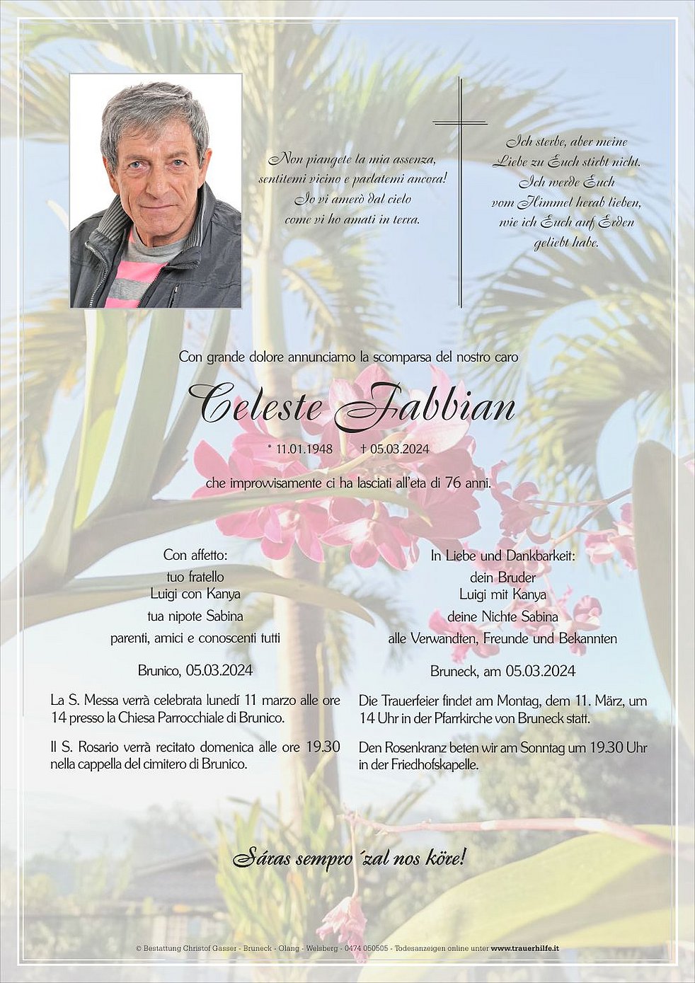 La S. Messa verrà celebrata lunedí 11 marzo alle ore 14 presso la Chiesa Parrocchiale di Brunico.