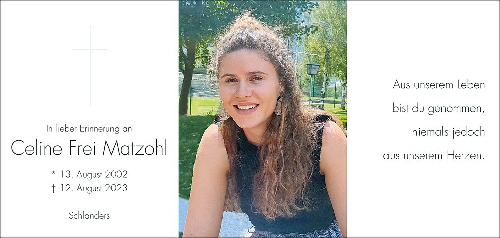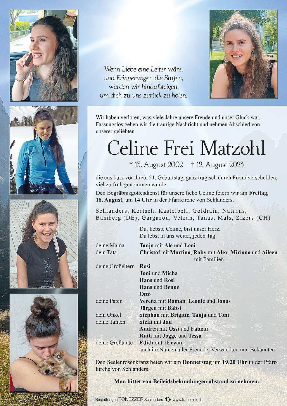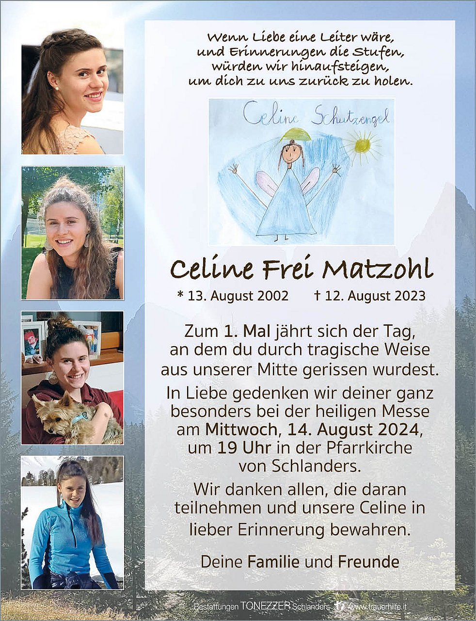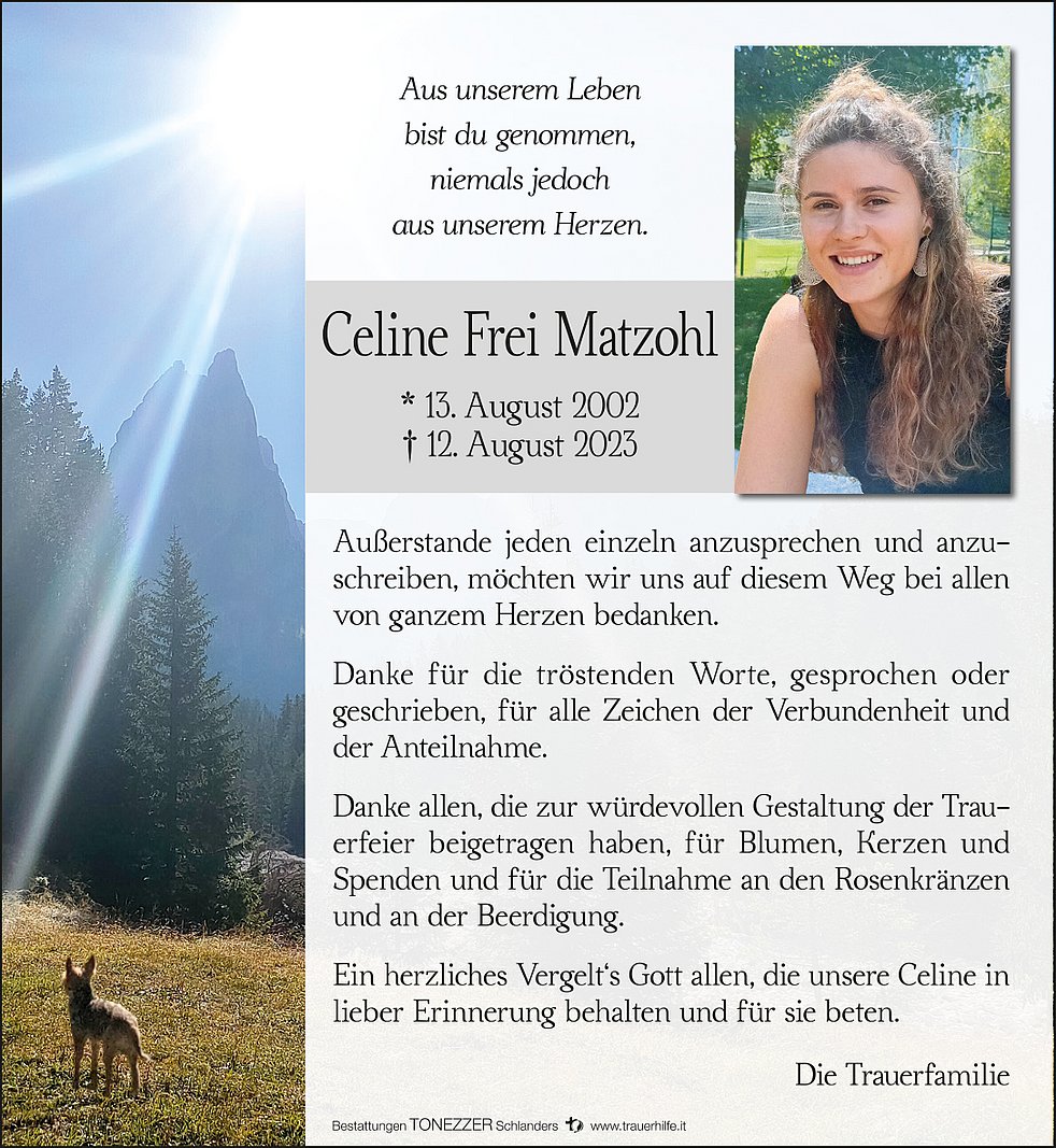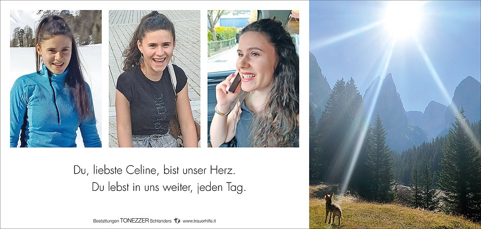 Den Begräbnisgottesdienst für unsere liebe Celine feiern wir am Freitag, 18. August, um 14 Uhr in der Pfarrkirche von Schlanders.