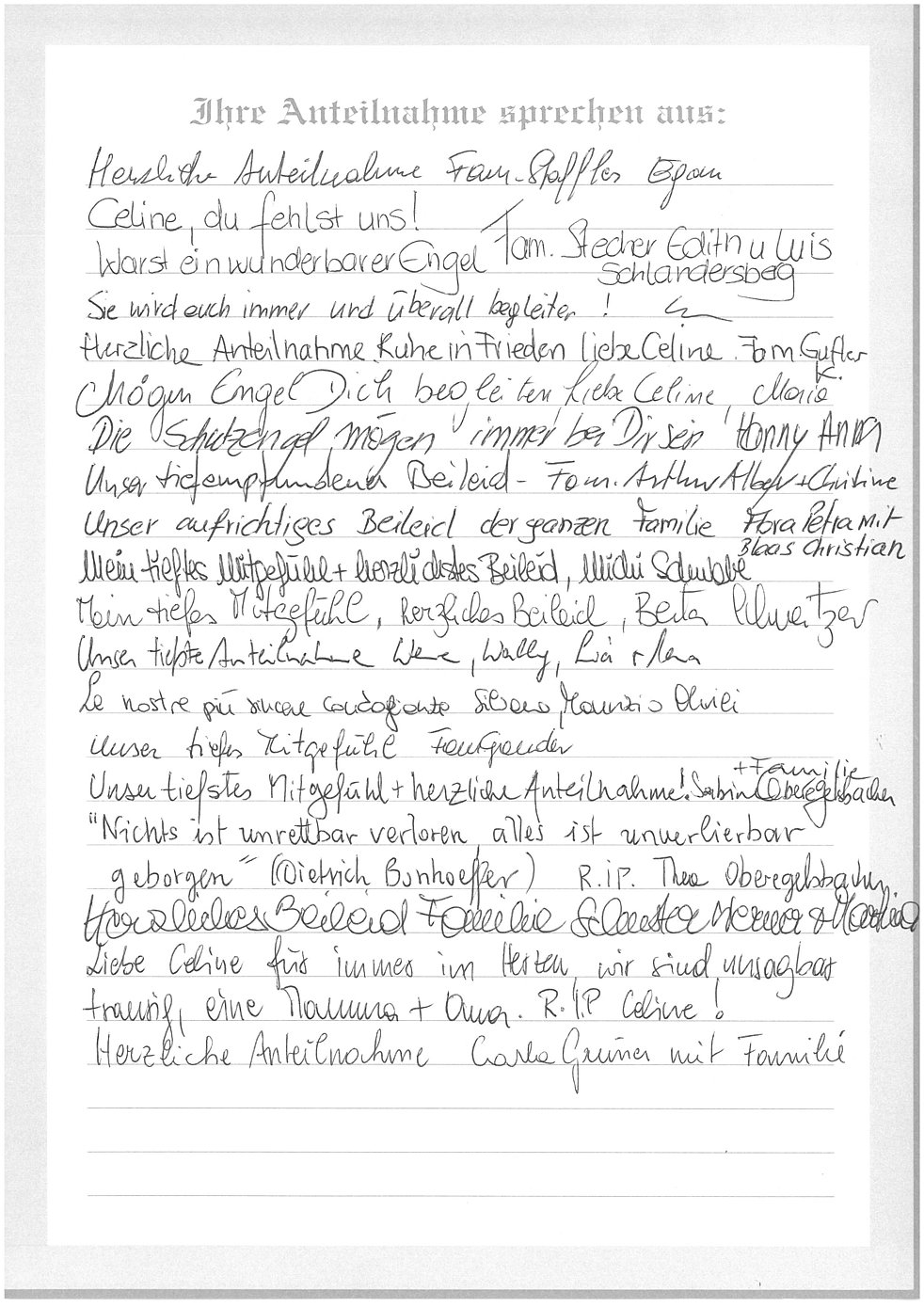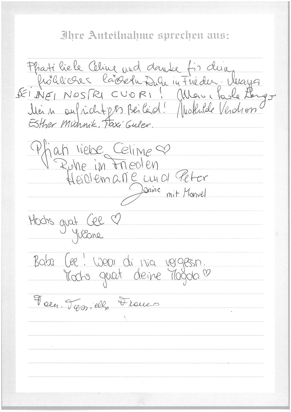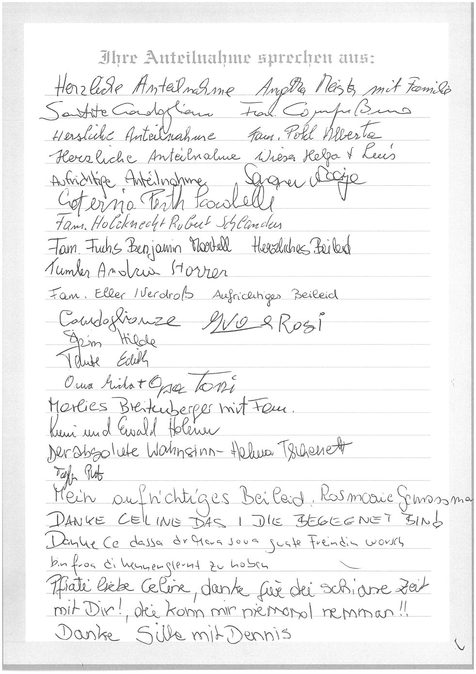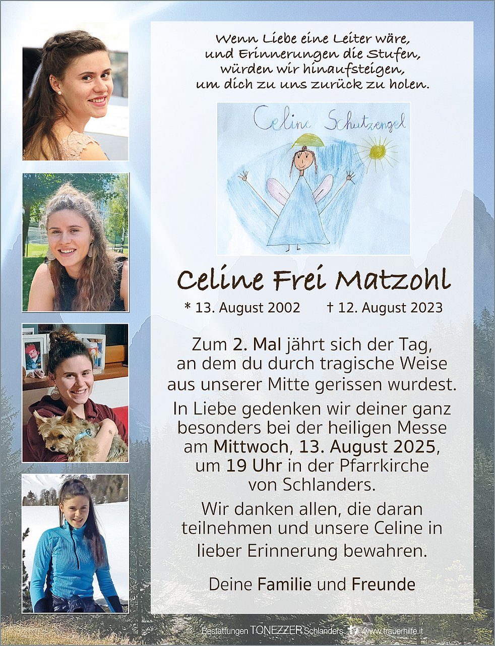 Den Begräbnisgottesdienst für unsere liebe Celine feiern wir am Freitag, 18. August, um 14 Uhr in der Pfarrkirche von Schlanders.