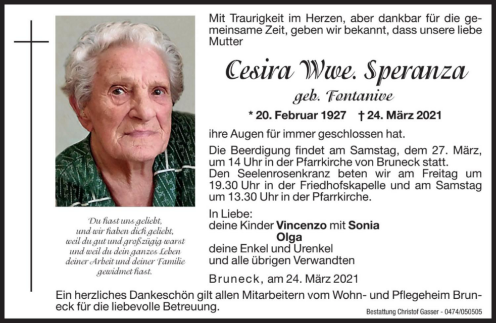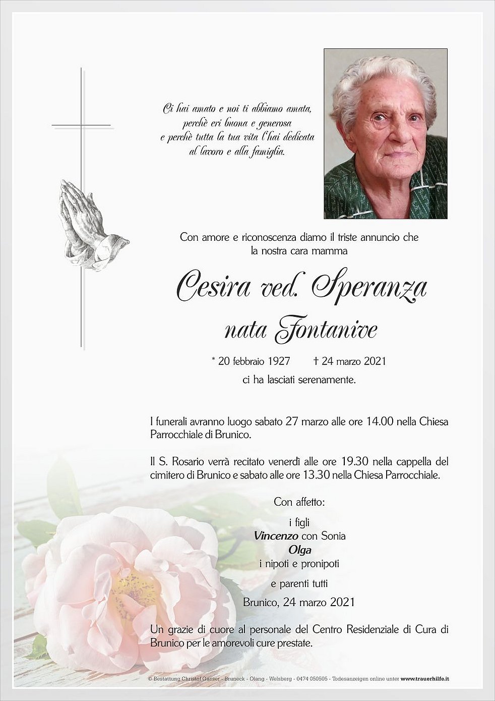 I funerali avranno luogo sabato 27 marzo alle ore 14.00 nella Chiesa Parrocchiale di Brunico.