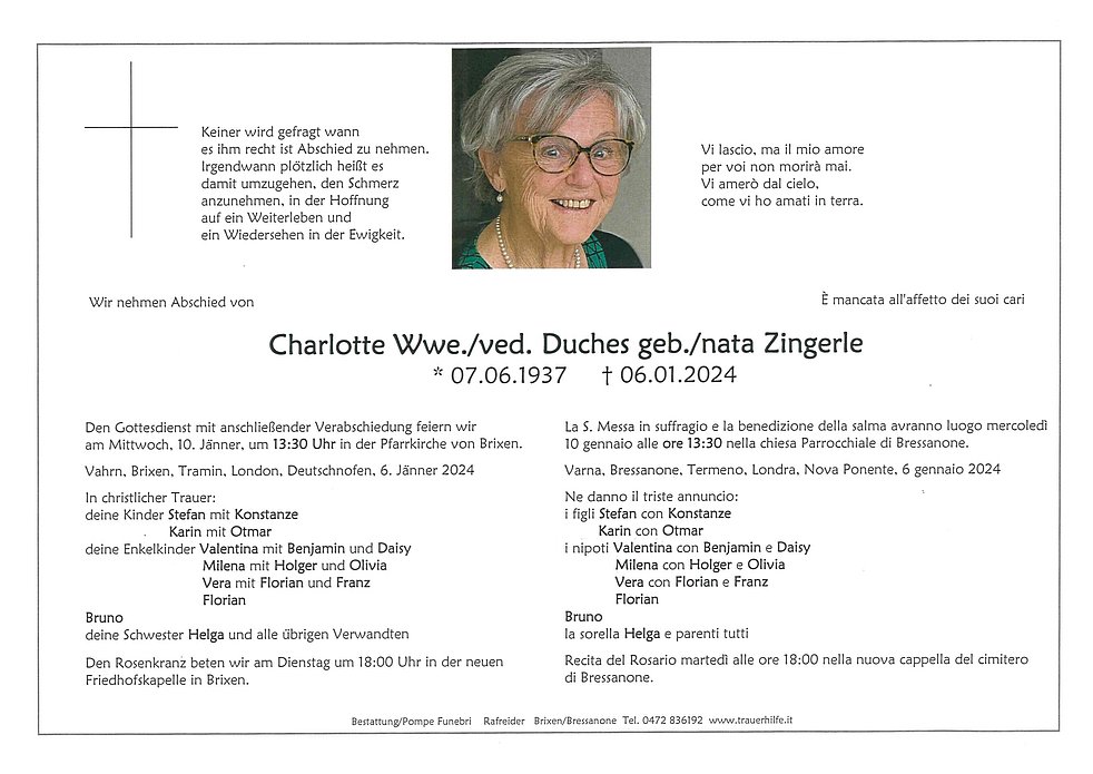 Trauerfeier: 10.01. - 13:30 Uhr Pfarrkirche Brixen