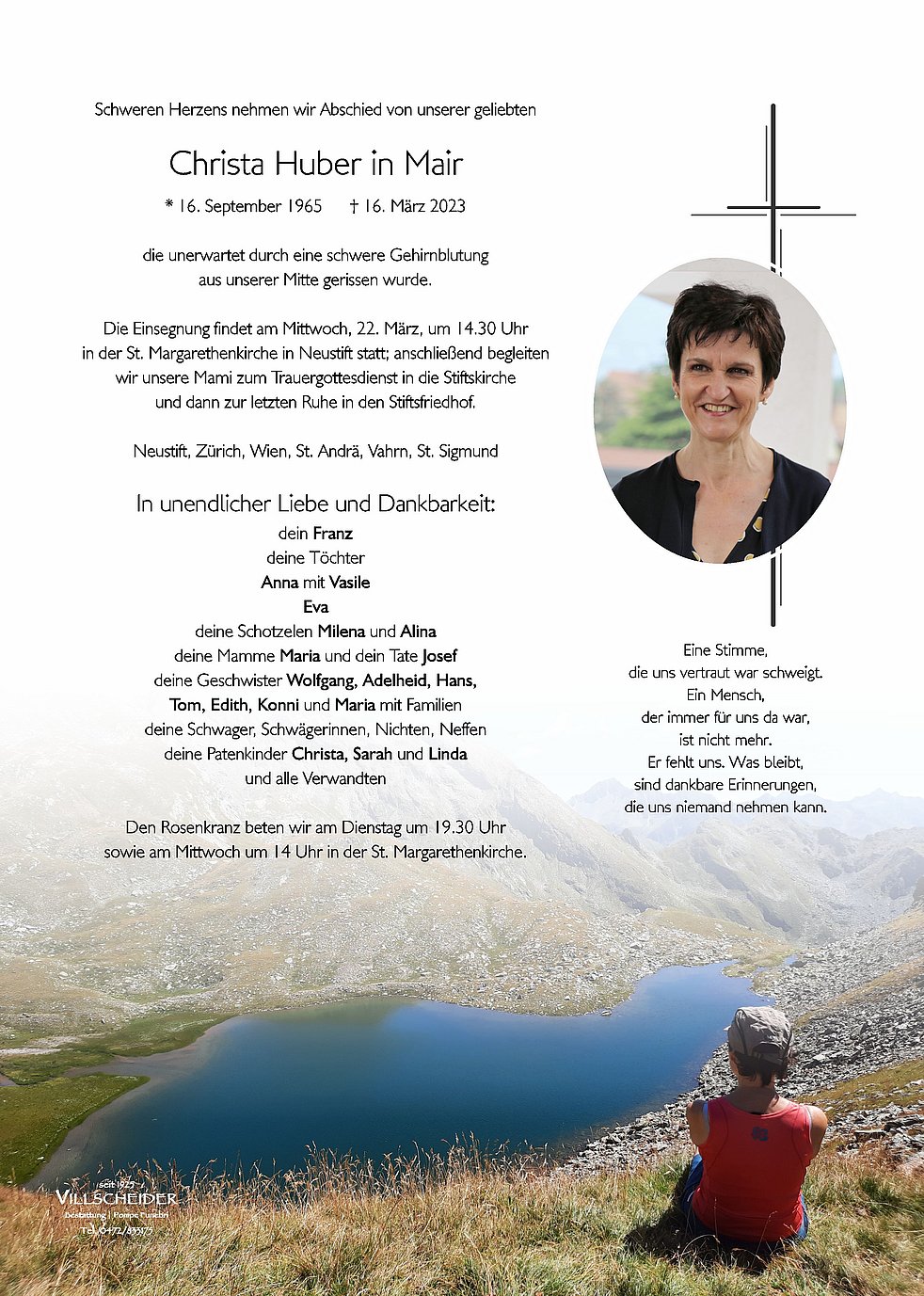 Liebe Maria und euch allen der Familie Huber, unser aufrichtiges herzlichstes Beileid für eure liebe Christa, tut uns so leid Umarmung von Ulli Rabanser mit Familie