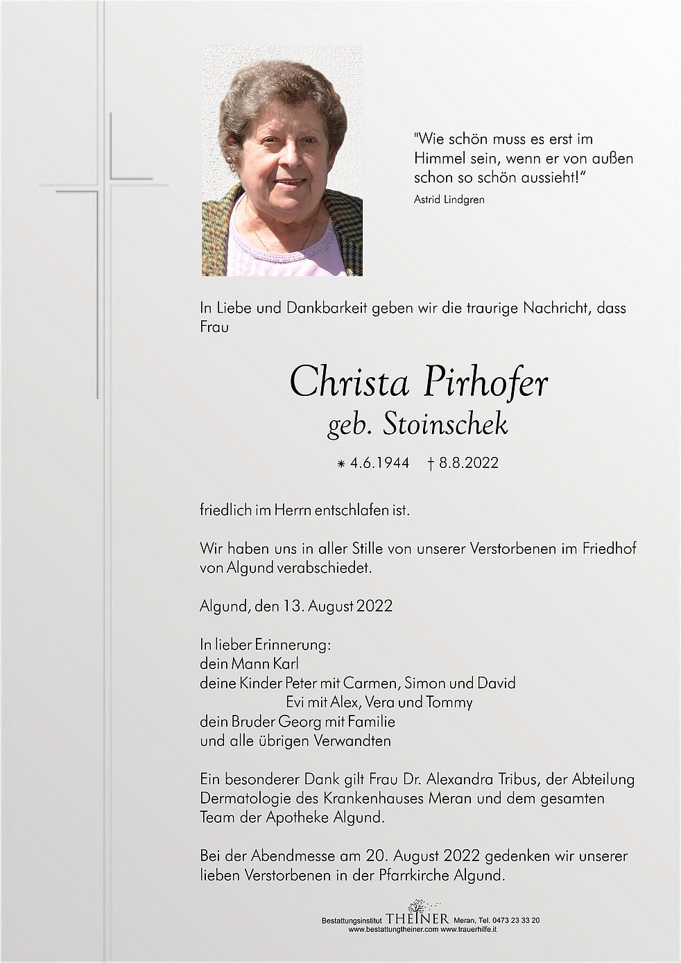 Bei der Abendmesse am 20. August 2022 gedenken wir unserer lieben Verstorbenen in der Pfarrkirche Algund.
