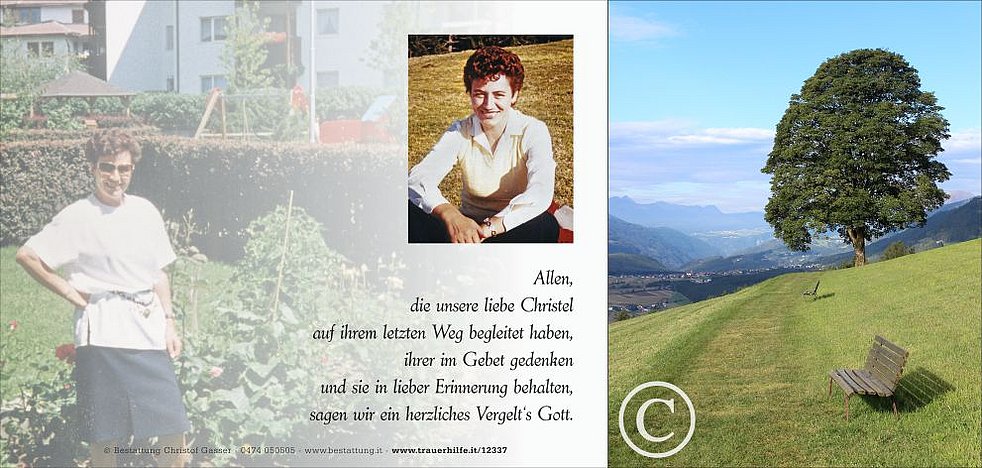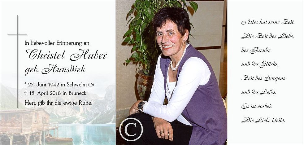Ein besonderer Dank gilt unserem Dr. Burger (Didi), der Hausärztin Dr. Brigitte Viehweider sowie dem gesamten Personal vom 5. Wohnbereich des Wohn- und Pflegeheimes Bruneck für die liebevolle Betreuung.