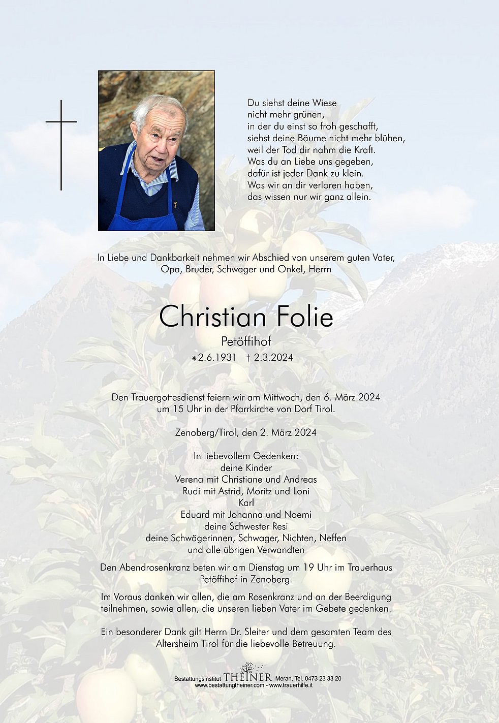Den Trauergottesdienst feiern wir am Mittwoch, den 6. März 2024 um 15 Uhr in der Pfarrkirche von Dorf Tirol.