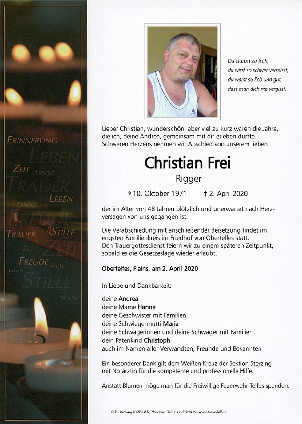 Lieber Christian, wunderschön, aber viel zu kurz waren die Jahre, die ich, deine Andrea, gemeinsam mit dir erleben durfte.