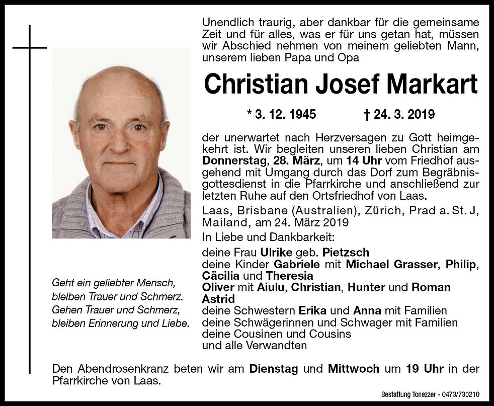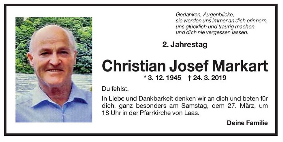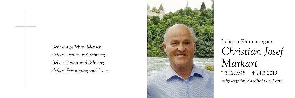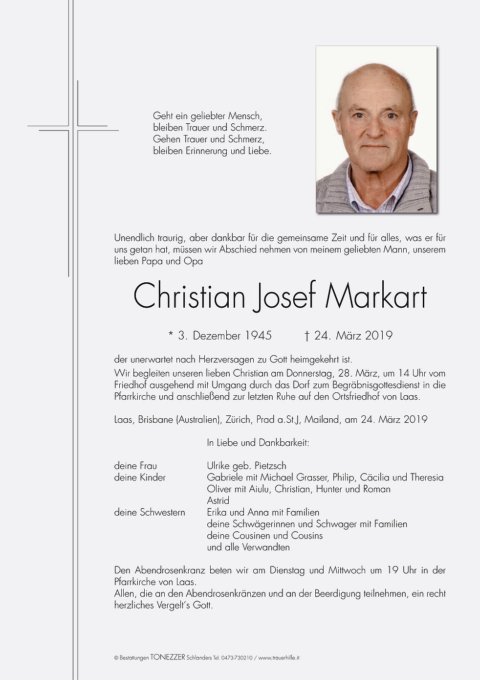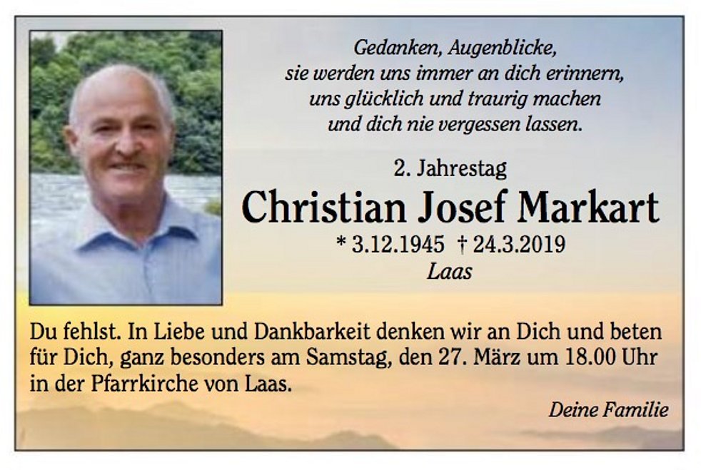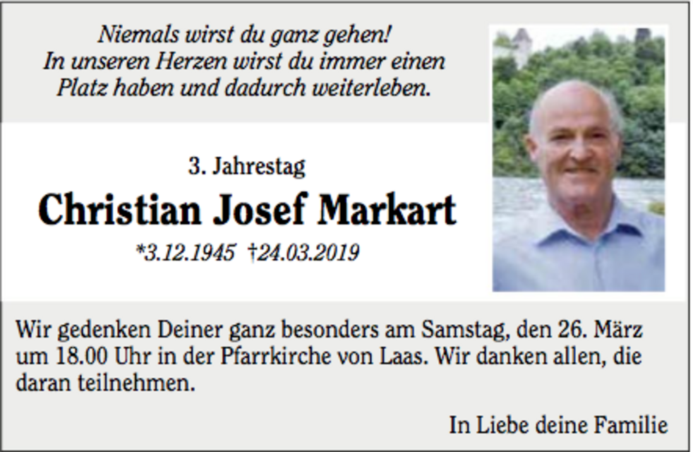 Wir begleiten unseren lieben Christian am Donnerstag, 28. März, um 14 Uhr vom Friedhof ausgehend mit Umgang durch das Dorf zum Begräbnisgottesdienst in die Pfarrkirche und anschließend zur letzten Ruhe auf den Ortsfriedhof von Laas.