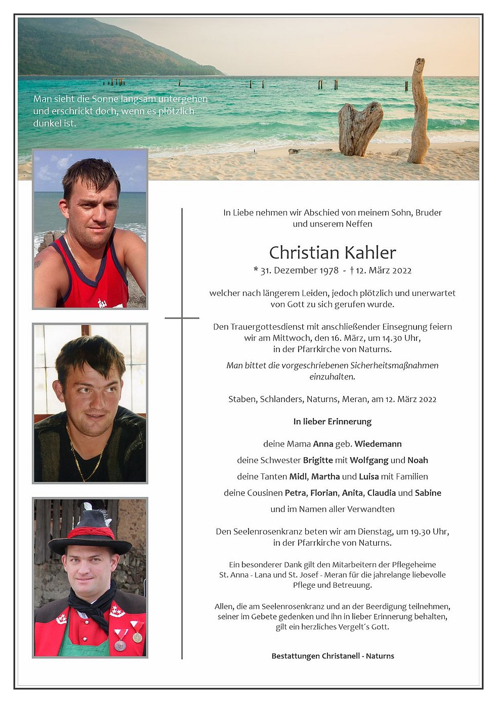 Den Trauergottesdienst mit anschließender Einsegnung feiern wir am Mittwoch, den 16. März, um 14.30 Uhr, in der Pfarrkirche von Naturns.
