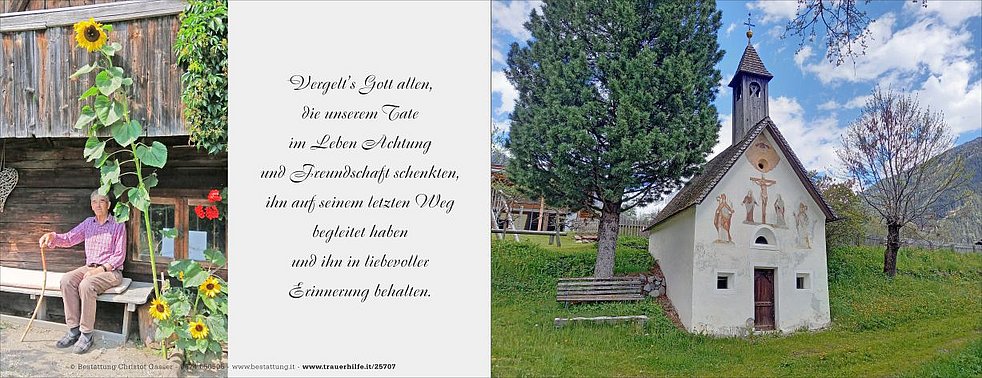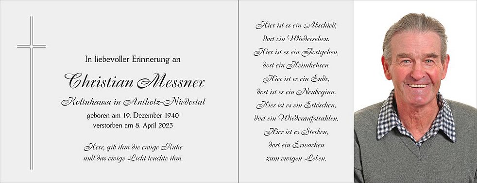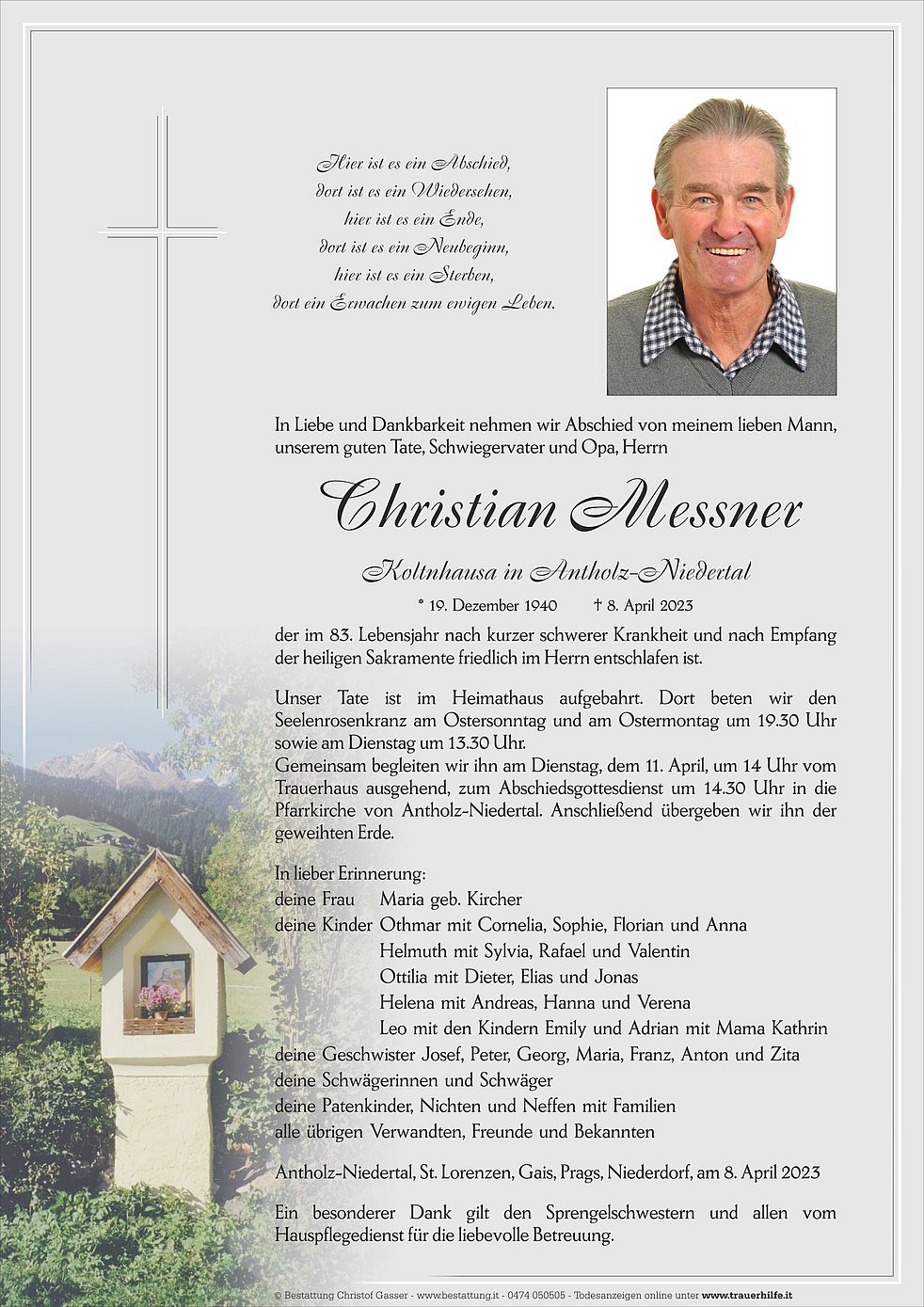 Gemeinsam begleiten wir ihn am Dienstag, dem 11. April, um 14 Uhr vom Trauerhaus ausgehend, zum Abschiedsgottesdienst um 14.30 Uhr in die Pfarrkirche von Antholz-Niedertal. Anschließend übergeben wir ihn der geweihten Erde.