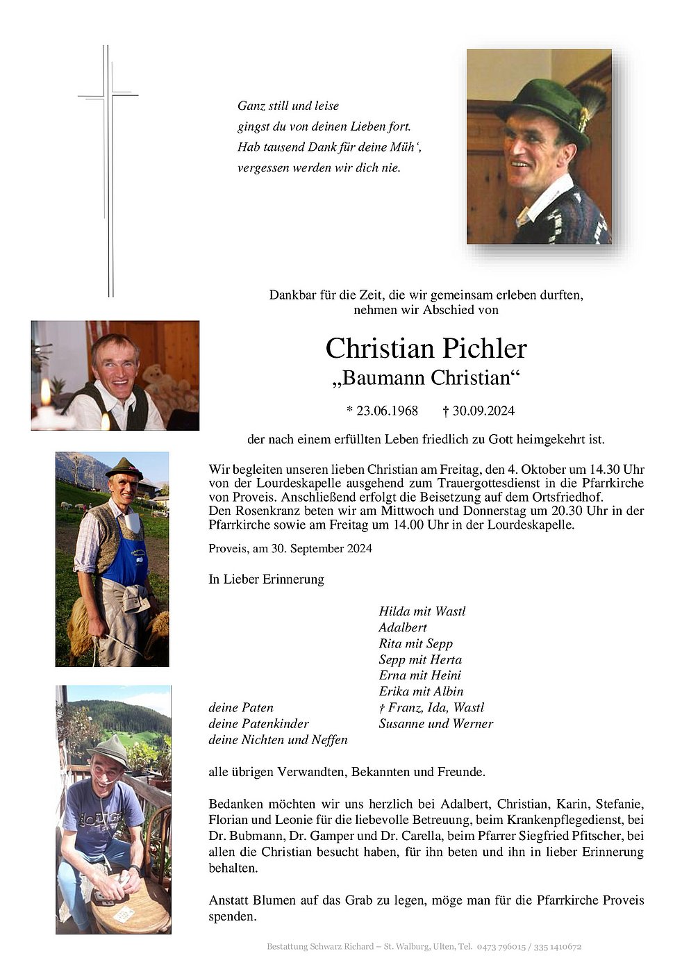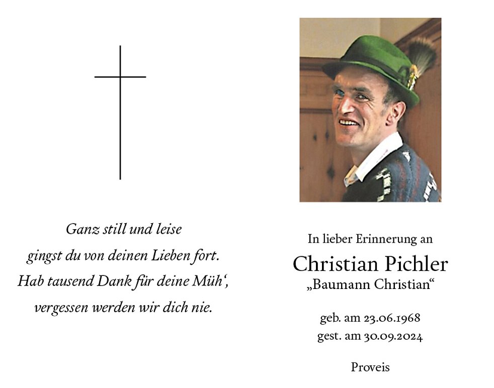 Wir begleiten unseren lieben Christian am Freitag, den 4. Oktober um 14.30 Uhr von der Lourdeskapelle ausgehend zum Trauergottesdienst in die Pfarrkirche von Proveis. Anschließend erfolgt die Beisetzung auf dem Ortsfriedhof.