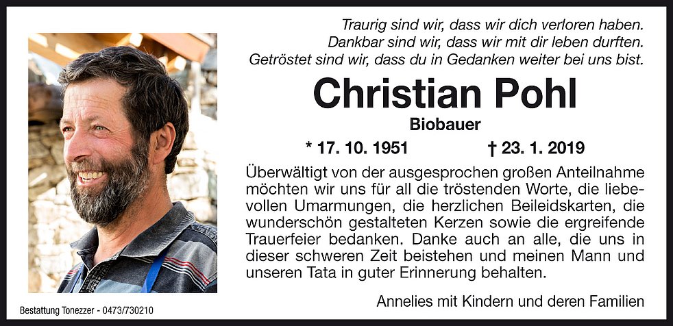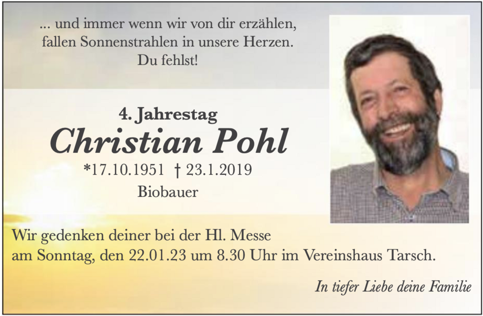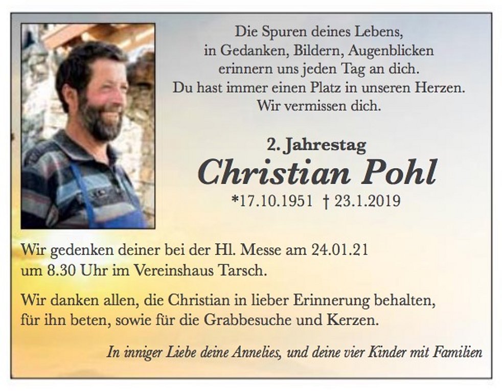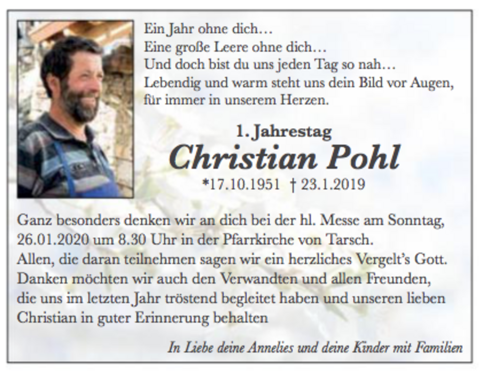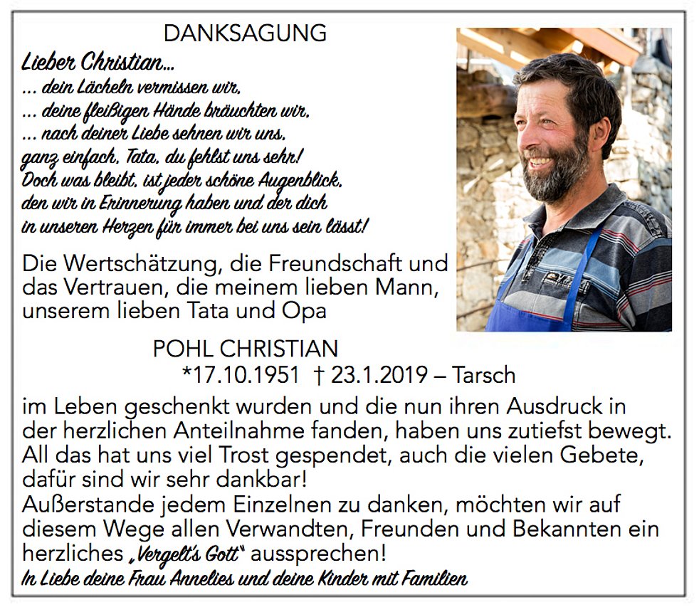 Wir begleiten unseren lieben Christian am Samstag, 26. Jänner, um 14.30 Uhr vom Trauerhaus aus zum Begräbnisgottesdienst in die Pfarrkirche und anschließend zur letzten Ruhe auf den Ortsfriedhof von Tarsch.