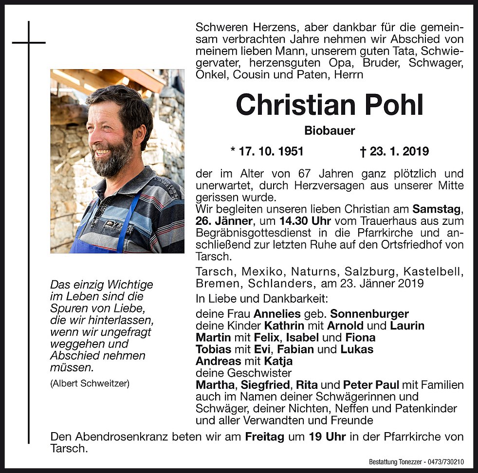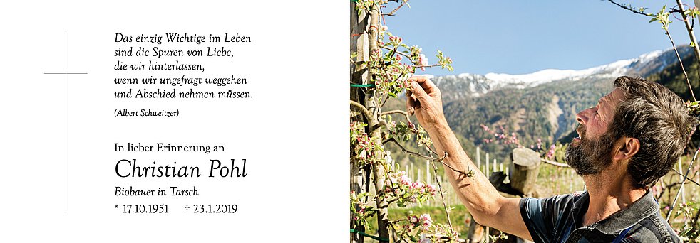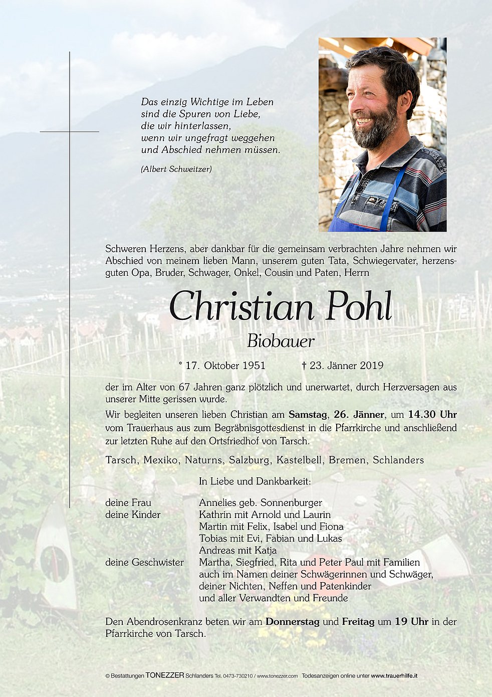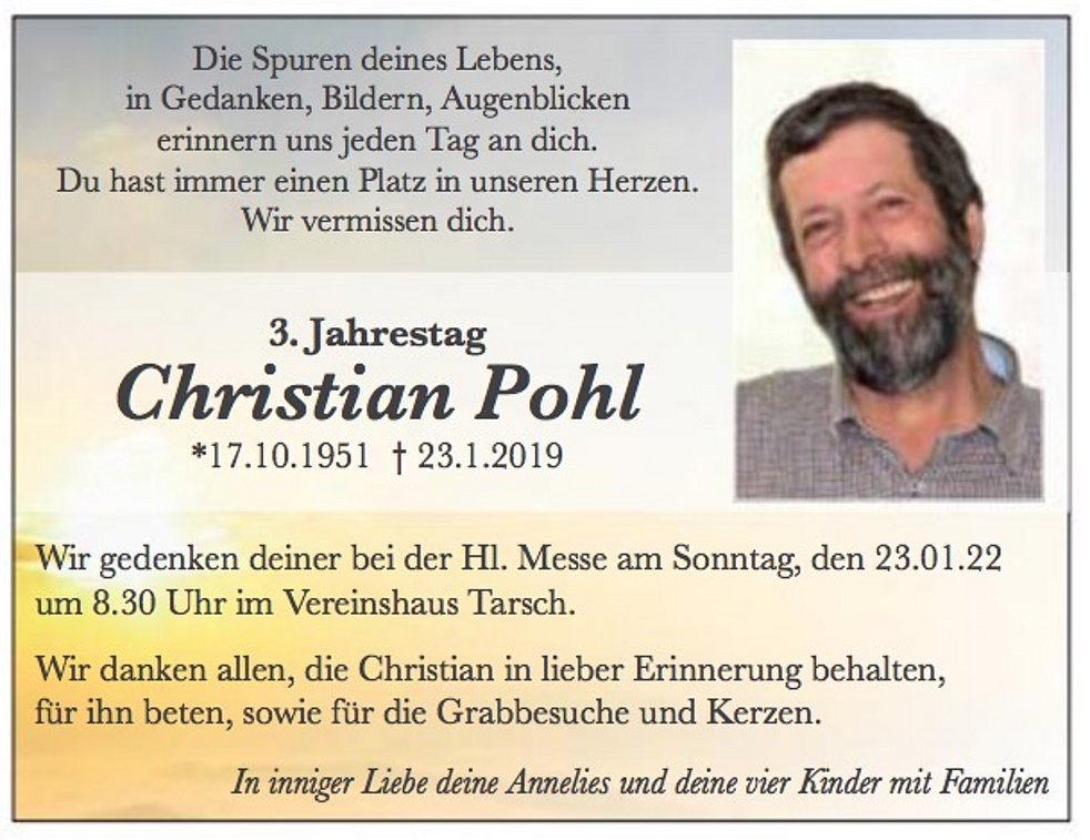 Wir begleiten unseren lieben Christian am Samstag, 26. Jänner, um 14.30 Uhr vom Trauerhaus aus zum Begräbnisgottesdienst in die Pfarrkirche und anschließend zur letzten Ruhe auf den Ortsfriedhof von Tarsch.
